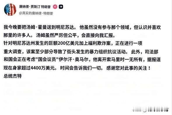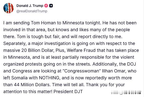特朗普:我今晚派汤姆·霍曼去明尼苏达州。他之前没有参与过那个地区的事情,但他认识那里很多人,也很喜欢他们。汤姆为人强硬但公正,他会直接向我汇报工作。 汤姆·霍曼(Tom Homan),1961年生,毕业于纽约州立大学理工学院刑事司法专业,是一名美国前警察,曾任美国移民与海关执法局代理局长,现任美国白宫边境事务主管。汤姆·霍曼是位于华盛顿特区的保守派智库传统基金会的访问学者,他还是非营利组织“Border 911 Foundation Inc”的创始人,该组织称其反对“边境入侵”。