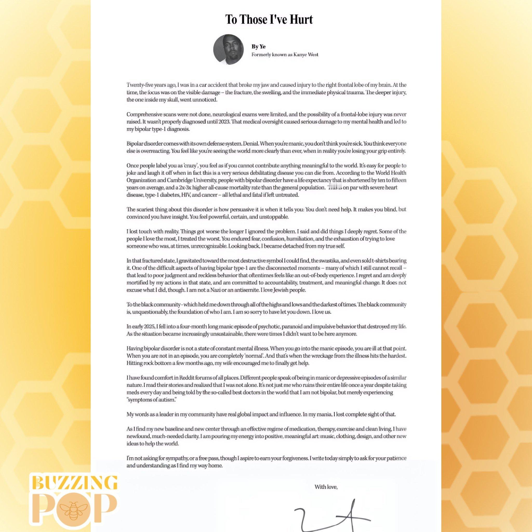 侃爷公开为其反犹言论致歉‼️据外媒,侃爷Kanye West在《华尔街日报》的付费公开信广告中,就其针对犹太人和黑人社区的不当言论致歉,并将其归因于早年一场车祸造成的神经损伤。侃爷表示几个月前他跌入人生谷底时,妻子比安卡鼓励他寻求帮助。“二十五年前,我遭遇了一场车祸,导致下颌骨折,并造成大脑右额叶损伤。当时,所有人的关注点都集中在可见的伤害上——骨折、肿胀以及即时的身体创伤。而更深层的、颅内的损伤却被忽视了。既未进行全面的扫描检查,神经系统检查也极为有限,额叶受损的可能性从未被提及。直到2023年,我才得到了正确的诊断。那次医疗疏漏严重损害了我的心理健康,并最终导致我被诊断为双相情感障碍Ⅰ型。双相障碍自有一套防御机制,那就是否认。当你处于躁狂状态时,你并不认为自己病了。你认为别人都反应过度。你感觉自己比以往任何时候都更看清这个世界,而实际上,你正完全失去控制。一旦被人贴上“疯子”的标签,你会觉得自己再也无法为这个世界贡献任何有意义的东西。人们很容易对此一笑了之,但事实上,这是一种非常严重、可能致命的致残性疾病。根据世界卫生组织和剑桥大学的研究,双相障碍患者的平均寿命比普通人缩短十到十五年,全因死亡率是普通人群的2到3倍。这与严重的心脏病、Ⅰ型糖尿病、艾滋病和癌症不相上下——若不加治疗,它们都是致命的。这种疾病最可怕之处在于,它会极具说服力地告诉你:你不需要帮助。它让你盲目,却让你坚信自己明察秋毫。你感到强大、确信、势不可挡。我与现实脱节了。问题被我忽视得越久,情况就变得越糟。我说了、做了许多让我深感懊悔的事。我伤害最深的,恰恰是那些我最爱的人。你们承受了恐惧、困惑、羞辱,以及试图去爱一个有时已面目全非之人所带来的身心俱疲。回首往事,我背离了真实的自我。在那个支离破碎的状态下,我被当时所能找到的最具破坏性的符号所吸引——纳粹万字符,甚至曾售卖印有此图案的T恤衫。患有双相Ⅰ型障碍最痛苦的一面,在于那些思维断裂的时刻——其中许多我至今仍无法回忆——它们导致判断力低下和鲁莽行为,常常感觉像是一场“灵魂出窍”的体验。我为我在那种状态下所做的一切感到懊悔并深感羞愧,我决心承担责任、接受治疗、做出有意义的改变。但这并不能成为我的借口。我并非纳粹或反犹主义者。我热爱犹太人。致黑人社区——在我经历所有高潮、低谷以及至暗时刻,始终支撑着我的黑人社区。毫无疑问,黑人社区是我身份的根基。我很抱歉辜负了你们。我爱我们所有人。2025年初,我陷入了一场持续四个月的躁狂发作,伴随着精神病性、偏执和冲动行为,它摧毁了我的生活。随着情况变得日益难以承受,曾有几次,我不想再存在于世了。患有双相障碍并不意味着一直处于精神疾病的状态。当你进入躁狂发作期时,你才是在生病。当你不处于发作期时,你是完全正常的。而恰恰是这时,疾病造成的破坏所带来的打击最为沉重。几个月前跌入谷底时,我的妻子鼓励我终于去寻求帮助。我竟然在Reddit论坛上找到了慰藉。不同的人们谈论着与我性质相似的躁狂或抑郁发作经历。我读着他们的故事,意识到我并不孤单。并不仅仅是我,尽管每天服药,却被那些所谓的世界上最好的医生告知我不是双相,而仅仅是“自闭症症状”,然后每年毁掉一次自己的生活。作为我所在社区的领导者,我的言辞具有真实且全球性的影响力。在躁狂中,我完全忽视了这一点。如今,通过有效的药物治疗、心理治疗、锻炼和健康的生活方式,我正在寻找新的基准和新的中心。我获得了新的、亟需的清醒。我将我的能量倾注于积极、有意义的艺术:音乐、服装设计以及其他帮助世界的新想法。我并非寻求同情或赦免,尽管我渴望赢得你们的宽恕。今日提笔,我只恳请大家在我寻找回归之路时,能给予耐心与理解。