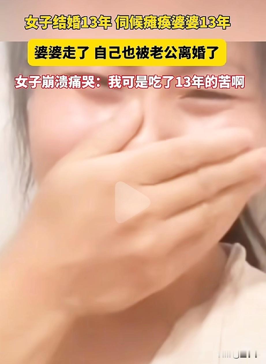婚姻中最不值钱的就是吃苦! 女子结婚13年,伺候了瘫痪婆婆13年,然而婆婆离世了,自己却被老公给离婚了,女子崩溃大哭,自己可是吃了13年的苦啊。 很悲哀! 这男的一开始就是找个免费的保姆回来伺候他的妈妈吧,老人走了,免费的保姆不需要了,男子立马就把免费保姆给送走了,这算盘打的真响啊。 真心未必能换来真心! 所以,不管在什么时候,都要对自己好点,也要给自己留一条退路。