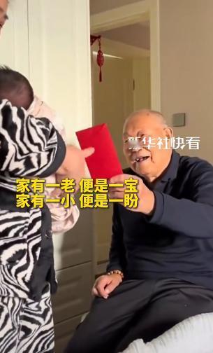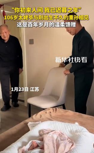 1月23日,江苏一刚出生的小宝宝出院回家,106岁的太姥爷得知后,赶紧拄着拐杖前来看望,看到小宝宝的的那一刻,眼神都亮了,还亲手送上红包,这跨越百年的相见,看得让人鼻子发酸。   这本是一场寻常的家庭团聚,对一位106岁的老人而言,却像是一场拼尽全力的奔赴。   百岁之后,日子大多是缓慢而平和的,可自从听说第五代重孙要出院回家,老人的生物钟像是被重新拨动,连续两个晚上都没睡安稳。   不是辗转难眠的焦虑,而是刻在基因里的血脉眷恋,压过了身体的衰老与疲惫,让他满心都是期待。   天还没亮,老人就催促着家人扶他坐在堂屋的正位上。平日里爱不释手的茶水,就放在手边却一口未动,他支棱着耳朵,像守着约定似的,仔细捕捉着院外每一丝动静,生怕错过孩子回来的声响。   当远处传来汽车鸣笛声,那声音像一道信号,原本静坐的老人突然有了力气,猛地撑着桌沿就要起身,干枯的手指因用力而泛出白痕,手里的旧拐杖此刻仿佛成了支撑他奔赴期待的依靠。   从堂屋到放着婴儿的卧室,不过短短几步路,老人却走得气喘吁吁,每一步都要靠着意志力拖动沉重的身体。   家人心疼他,劝他坐下等,让孩子抱过来见他,可老人性子犟,谁也拦不住。   他心里或许没有太多复杂的想法,只想着要亲自走到孩子身边,亲眼看看这个延续了自己血脉的小生命,做那个迎接“未来”的人。   推开门的那一刻,时光仿佛有了片刻的停顿。   此之前,老人的眼神带着岁月沉淀的浑浊与疲态,可当视线穿过儿子、孙子,最终落在襁褓中那团粉嫩的小生命上时,像是有一束光穿透了岁月的迷雾,那双老眼瞬间亮了起来。   浑浊散去,取而代之的是清澈又带着几分贪婪的光亮,仿佛要把这个刚来到世间的小家伙,牢牢刻进眼里、记在心里。   老花镜悄悄滑到了鼻尖,老人也浑然不觉。面对这个柔软的小生命,千言万语都显得多余,他只是反复念叨着“好娃,好娃”,简单的两个字里,藏着最纯粹的疼爱与赞叹。   他缓缓伸出手,那是一双经历过风雨的手,握过锄头、扛过岁月的艰辛,布满了像古树皮般的皱纹与老年斑,粗糙却充满力量。   可这只手在距离婴儿脸庞几厘米的地方,却轻轻悬停住了。他终究是怕了,怕自己掌心的粗粝,会不小心擦伤这块未经世事的璞玉。   迟疑了片刻,他才用指腹极轻地碰了碰婴儿攥紧的小拳头,力道轻得像一片羽毛。就是这一下轻微的触碰,让106年的沧桑岁月与几日的稚嫩新生,完成了最厚重的对接。   随后,老人从贴身的衣兜里摸出一个红包,递到了襁褓边缘。这红包格外用心,里面的钞票是他特意让人去银行换的新钞,红纸也是他亲手折叠的,揣在胸口许久,拿出来时还带着老人的体温。   这不仅是一份小小的馈赠,更是一场跨越百年的生命能量传递,是老一辈对新生一代最真挚的祝福。