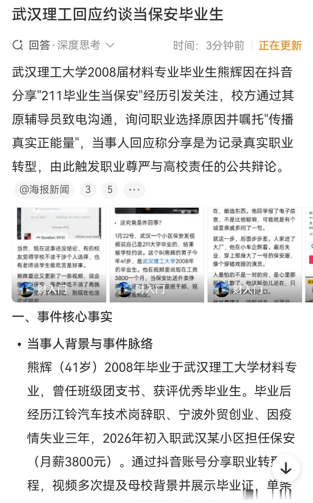 武汉理工回应约谈当保安毕业生母校宣传部通过其原辅导员与其沟通,了解其职业选择原因,并表达对内容可能影响学校形象的关切。校方希望他“传播真实正能量”。我还以为,帮他找了个工作。原来不是啊。 我们是社会主义国家,工作不分贵贱吧。