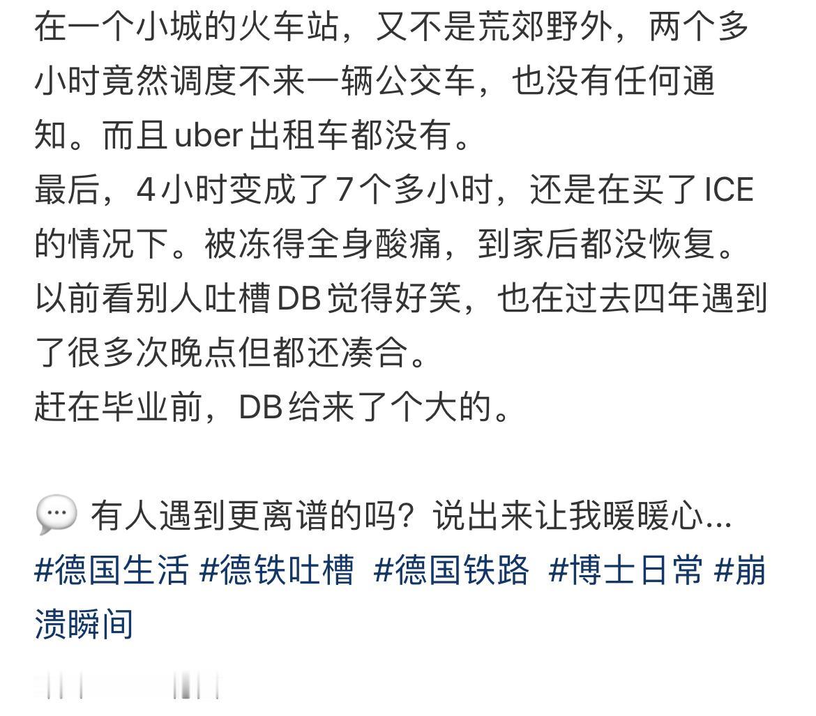 留学生吐槽德国火车,被德铁扔在路边7个小时,冻得瑟瑟发抖,也没有公交车和的士,只能在寒冷的天气干等着,本来DB延时德国人已经习惯了,但是等了这么久依然没有调度车,他们也不淡定了。德国的严谨守时原来只在书上