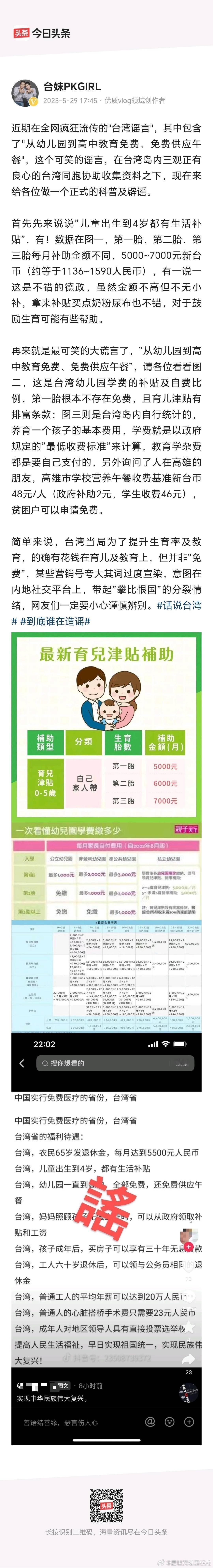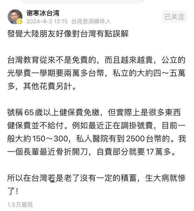 台湾省314人因冷空气去世很多人莫名其妙的说台湾医疗免费,癌症都不花钱——这个谣言不知道多少台湾人都辟谣过了。明显是认知战举个例子,近期比较热议的绿营艺人余天,他女儿前两年去世了,花了也有人民币几十万,买药和仪器治疗等等
