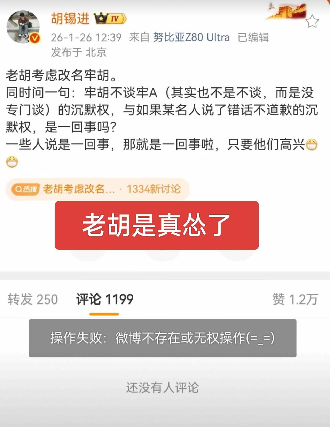 老胡是真怂了,害怕大家哪胡不开提哪胡!已经准备摆烂了!反正一切解释权归老胡所有! 老胡考虑准备跟牢A姓了,改名牢胡,变相的谈牢A了,用很隐晦的方式但又略险扭捏,于是又把权限设为仅自己可见,继续行使沉默权! 而且明确这不同于不道歉的沉默权,真不知道不同在哪里?一个是打不过就加入?一个是死不认账的摆烂吗? 胡锡进