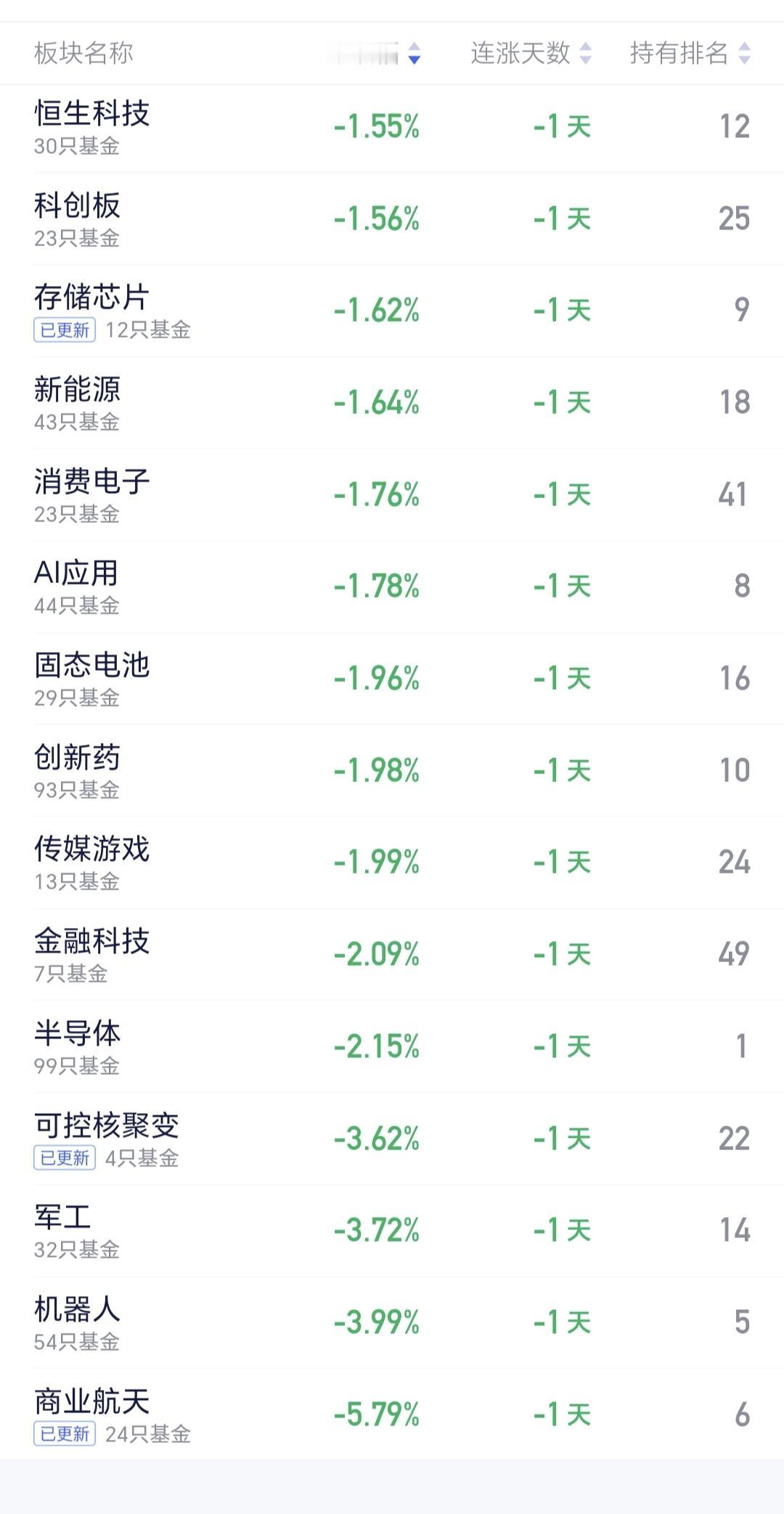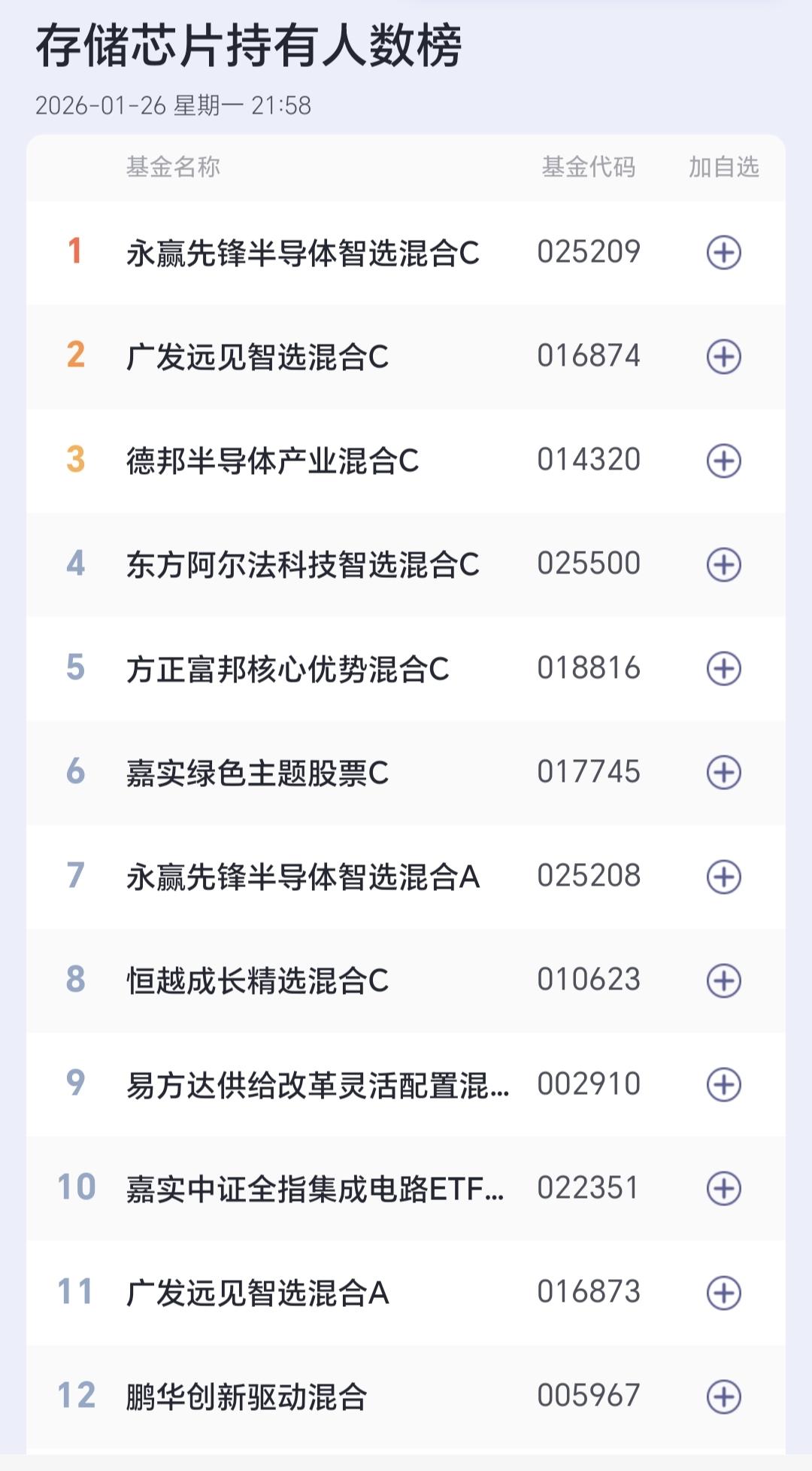 基金:存储芯片板块应该怎么办 我前段时间经常说,热门板块最近涨得有多疯狂,将来就会让你有多迷茫,昨天商业航天板块下跌幅度最大,在所有板块当中下跌得最多,板块下跌了5.79%,这个板块里面散户的人数也比较多,持有人人数在所有板块当中排名第6位。 存储芯片昨天也是下跌,板块下跌了1.62%,持有人数在所有板块当中排名第9位,加仓人数排行榜见下面的截图3,持有人数排行榜见下面的截图4,加仓人数最多的是广发远见智选混合,持有人数最多的是永赢先锋半导体智选混合。 看下面的截图5,这是存储板块日K线图,昨天的下跌到了上涨通道下轨线附近,近期观察是遇到支撑反弹,还是会跌破上涨通道的下轨线,如果跌破上涨通道的下轨线,短线持有的人需要谨慎。 看下面的截图6,这是存储板块周K线图,前段时间上涨突破了上涨通道的上轨线,现在是在上轨线的上方震荡,昨天的下跌并没有改变这个板块周线级别的上涨趋势,长线持有的人可以继续持有,短线有可能的谨慎,不能改变这个板块大方向的向上。 存储芯片板块,短线观察会不会破位上涨趋势,长线大方向向上,长线持有的人可以继续持有。 大家帮忙评论,点赞,转发和分享,谢谢大家的支持。