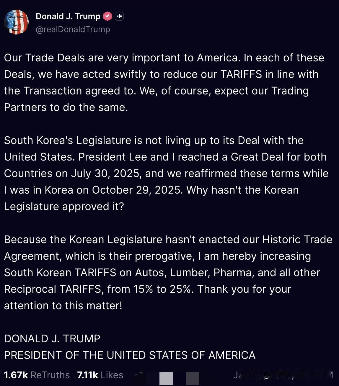 一大早,懵逼了? 🇺🇸被耍了?[捂脸]气的特朗普又要对韩国加征关税了,将对汽车,木材…关税从15%提高到25%。 按照特朗普的意思是韩国的立法机构未能履行和美国2025年7月3日达成的关税贸易协定。 其实,特朗普就是被耍了一下而已,这就不高兴了。要知道美国的关税贸易协定本来对韩国就是不平等的,人家立法机构要批准也是要走一套程序的,那程序那么简单?息怒息怒!你偷偷的不说,MAGA们还以为你早赢了呢。[捂脸]