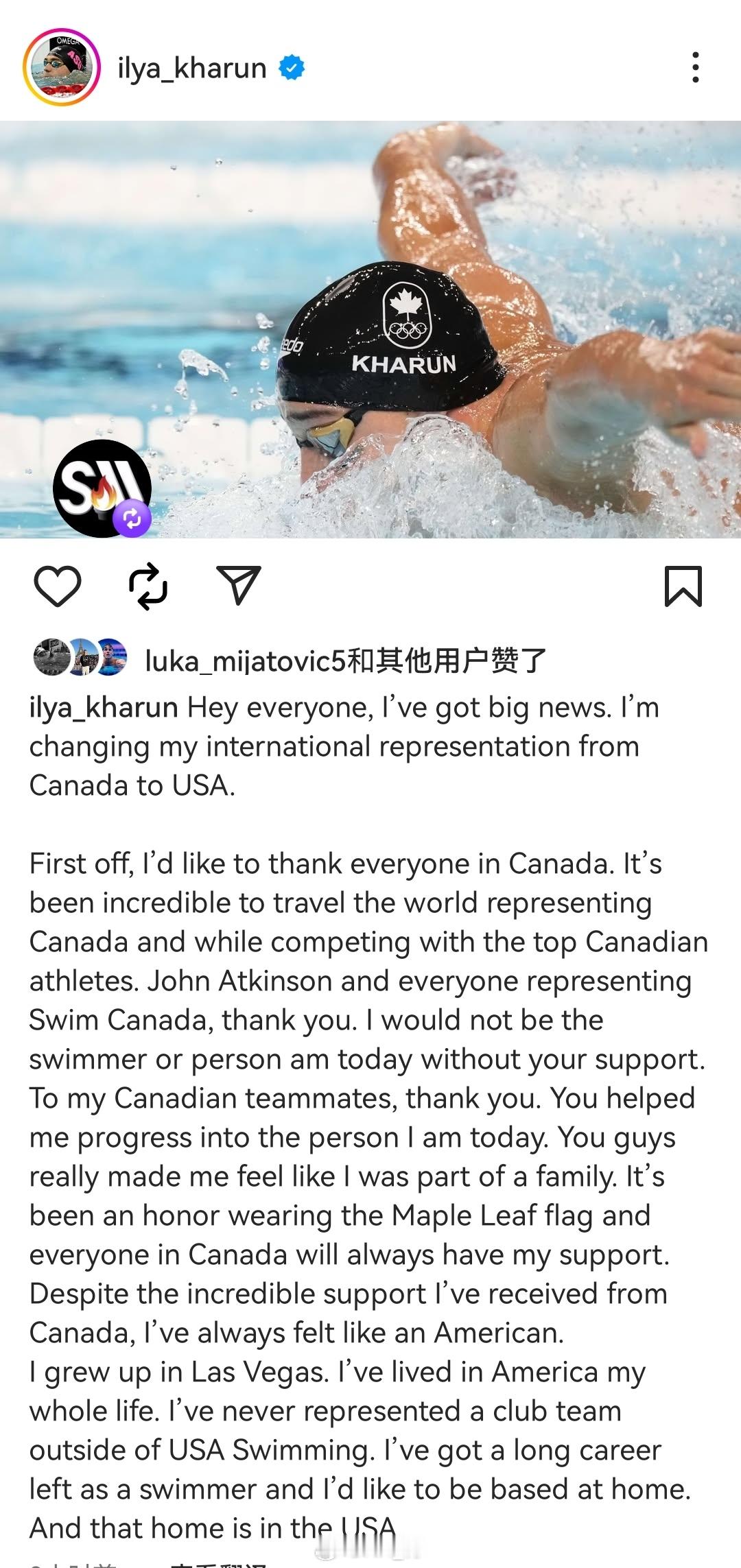 加拿大🇨🇦选手Ilya Kharun宣布将把自己体育国籍改成美国🇺🇸目前转籍等待期重新变回一年,以他最后一次代表加拿大时间🕙去年10月25日,他的体育公民身份变更将于今年10月26日正式生效,将能赶上美国短池世锦赛选拔赛,有望年底首次代表美国🇺🇸来北京参加短池世锦赛