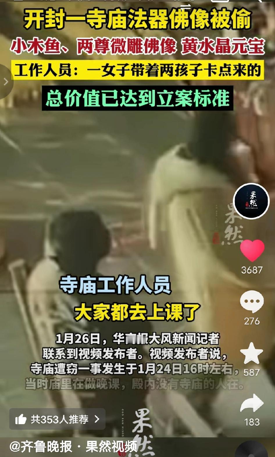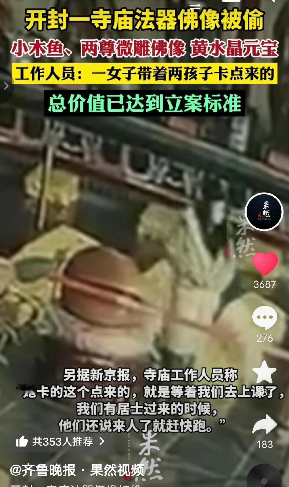 毁三观! 河南开封女子竟带俩娃,趁寺庙僧众晚课卡点偷法器,小 木鱼+佛像全拿走,网友怒喷:教娃坐牢呢?这不是坑孩子呢吗? 2026年1月24日下午4点,河南开封的这座寺庙里,僧人们正集体上晚课,大殿内暂时没有工作人员值守。 就在这时,一名女子带着两个孩子走进大殿。她先是假装上香祈福,四处观察确认没人后,迅速将供桌上的小木鱼、两尊掌心大小的微雕佛像,还有一枚黄水晶元宝塞进随身背包,还回头低声叮嘱孩子“别出声”,整个过程不到5分钟,动作娴熟又刻意。 等僧人晚课结束回到大殿,才发现供桌已被翻动,供奉的法器不翼而飞。调取监控后,大家才看清整个作案过程——原来女子是提前踩点,摸清了寺庙晚课时间,专门“卡点”前来行窃,还特意带上孩子打掩护。 据寺庙工作人员介绍,被盗的微雕佛像属于工艺藏品,黄水晶元宝也是供奉法器,并非普通纪念品,初步估算总价值已超过刑事立案标准。目前寺庙已向当地警方报案,案件正在进一步调查中。 更让人气愤的是,整个偷窃过程中,两个孩子就在旁边眼睁睁看着,女子丝毫没有避讳,用实际行动给孩子做了最坏的“示范”。 - “带着孩子偷东西,这哪是当妈,这是在教孩子坐牢!” - “连寺庙的东西都敢偷,还当着孩子的面,这心也太黑了!” - “卡点作案明显是有备而来,必须严惩,给孩子一个正确的教训!” - “寺庙是清净之地,这种行为不仅违法,更是缺德,希望警方尽快抓到人!” 当着孩子的面行窃,不仅触碰了法律底线,更给孩子的未来埋下了隐患。你对这个事情怎么看呢? 女子带娃偷寺庙法器 开封寺庙失窃案 争议民生 法律警示 缺德家长行为 来源:齐鲁晚报-果然视频及网络公开内容,如有侵权请联系即删 配图说明:本文配图/视频素材来自@齐鲁晚报-果然视频,仅用于内容分享,侵权联删