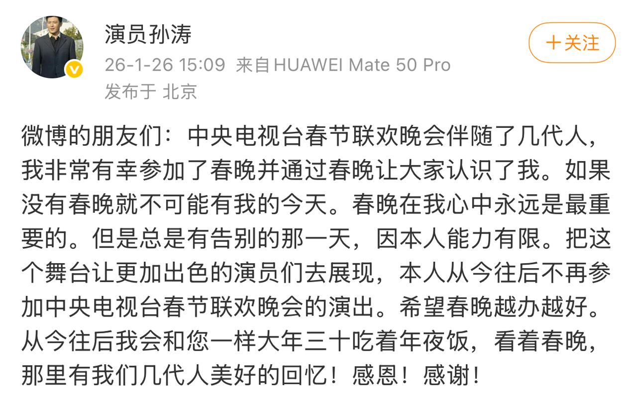 A:嘿,你看到孙涛发微博宣布告别春晚那事儿了吗? B:看到了呀,他说因为自己能力有限,想把舞台让给更优秀的年轻人呢,挺有自知之明的。 A:是啊,春晚这舞台多重要啊,他能做出这个决定也不容易。而且他已经连续好几年没上春晚了,这次算是正式官宣啦。 B:对,其实他早些年给咱留下了不少经典小品呢,像“我骄傲”这些台词现在都还印象深刻。 A:没错,虽然以后在春晚上看不到他了,但他对春晚有这份敬畏和奉献的心,还是值得尊重的。 B:确实,春晚也需要不断有新鲜血液注入,说不定以后真能涌现出更多优秀的作品和演员呢。 A:希望如此吧,也希望孙涛老师之后在其他方面能有更好的发展。