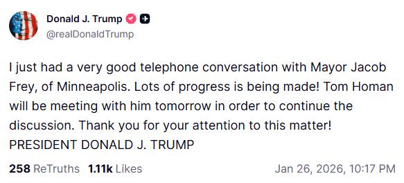 美国总统特朗普在社交媒体TruthSocial上宣布:他的边境沙皇汤姆·霍曼明天将与明尼阿波利斯市长雅各布·弗雷会面。他写道:“我刚刚和明尼阿波利斯市长雅各布·弗雷进行了一次非常好的电话交谈。进展很大!” 霍曼在政府初期被特朗普任命为边境沙皇。1月26日,他被派往明尼阿波利斯担任特朗普的“联络人”。此前联邦特工周六杀害亚历克斯·普雷蒂,此前在当地引发强烈反弹。