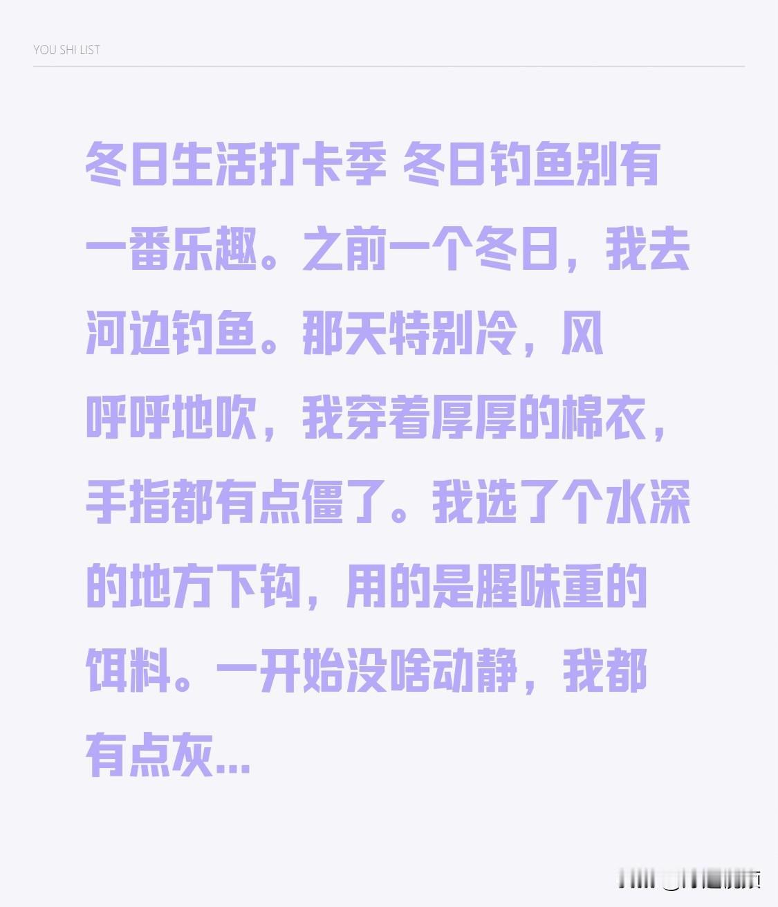 冬日生活打卡季 冬日钓鱼别有一番乐趣。之前一个冬日,我去河边钓鱼。那天特别冷,风呼呼地吹,我穿着厚厚的棉衣,手指都有点僵了。 我选了个水深的地方下钩,用的是腥味重的饵料。一开始没啥动静,我都有点灰心了。可就在我快坐不住的时候,鱼漂动了动,我赶紧集中注意力。紧接着鱼漂猛地往下一沉,我用力一提竿,嘿,一条鲫鱼上钩了!那一刻的兴奋劲儿,瞬间驱散了寒冷。冬日钓鱼虽然不易,但收获的快乐是其他季节比不了的。