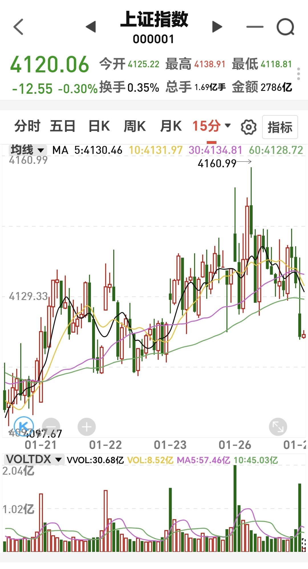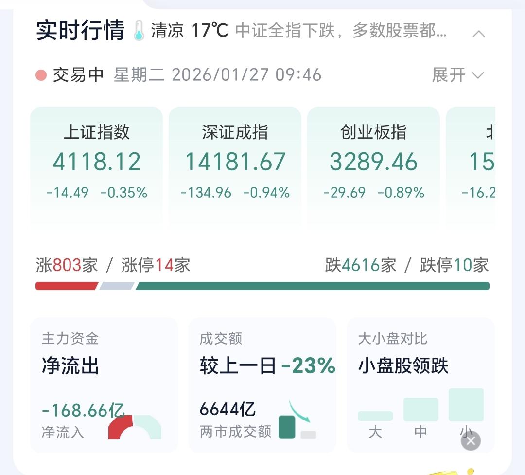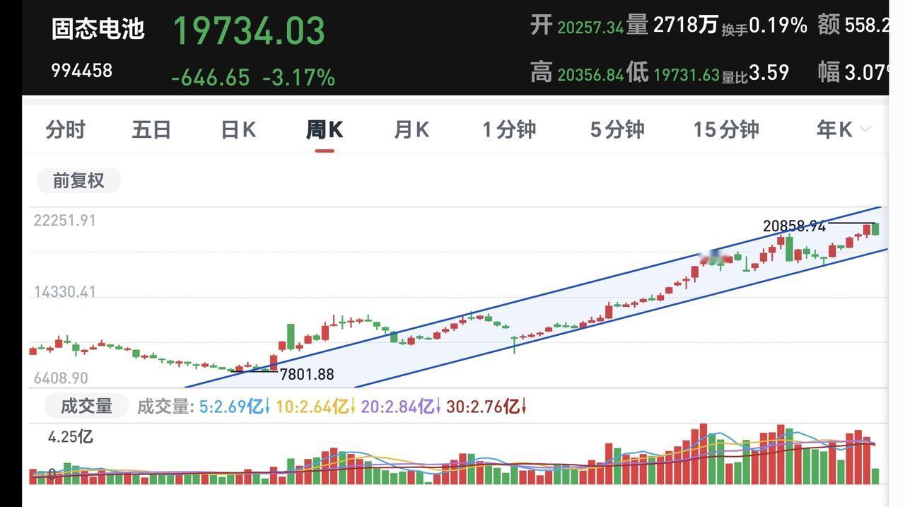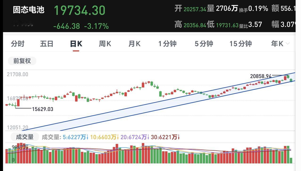基金:固态电池板块大跌,是进场还是离场 今天市场低开,三大指数都是低开,创业板指开盘下跌了0.09%,开于3316点,上证指数开盘下跌了0.18%,开于4125点。 开盘以后指数冲高回落,现在三大指数再度翻绿,黄色线在蓝色线下方,两条线之间的敞口比较大,第一个15分钟,成交量6644亿,相比于昨天同期缩量了23%,这是一个比较大的缩量幅度,可以看作是急剧缩量。 市场上涨800多家,下跌4600多家,下跌家数远远超过了上涨家数,涨停14家,跌停10家,好的是跌停家数不多,主力资金净流出168亿。 现在五天线位置是4125点,盘面点位4120点,跌破了五天线,后面观察能不能重新站上五天线,这是市场强弱的指标。 持有的基金中,现在盘中估值上涨的只有上证50板块,下跌幅度最大的三个板块是:新能源汽车板块,AI应用板块,可控核聚变板块,估值整体亏损了11390元。 市场现在下跌幅度最大的三个板块是:固态电池板块,储能板块,新能源板块,固态电池板块盘中估值下跌了2.88%,这是连续第二个交易日下跌,持有人数在所有板块当中排名第16位。 看下面的截图9,这是固态电池板块日K线图,今天的下跌已经到了上涨通道的下轨线附近,近期观察会不会跌破这个上涨通道的下轨线,如果跌破这个上涨通道的下轨线,短线的人是不建议考虑进场的,如果今天在这里收一个长下影线,收盘的时候重新回到上涨通道内,短线想进场的人也是可以考虑的。 看下面的截图10,这是固态电池板块周K线图,现在的位置处于这个上涨通道内,今天的大跌并没有跌破这个上涨通道的下轨线,今天的大跌并没有改变固态电池板块周线级别的上涨趋势,长线持有的人可以继续持有。 记得我昨天让管住手的人在评论区回复一下,前段时间就是让你不相信市场会跌,只要跌下去,就能拉上来,事情不可能永远都是这样,今天就有可能会不一样。 大家帮忙评论,点赞,转发和分享,谢谢大家的支持。