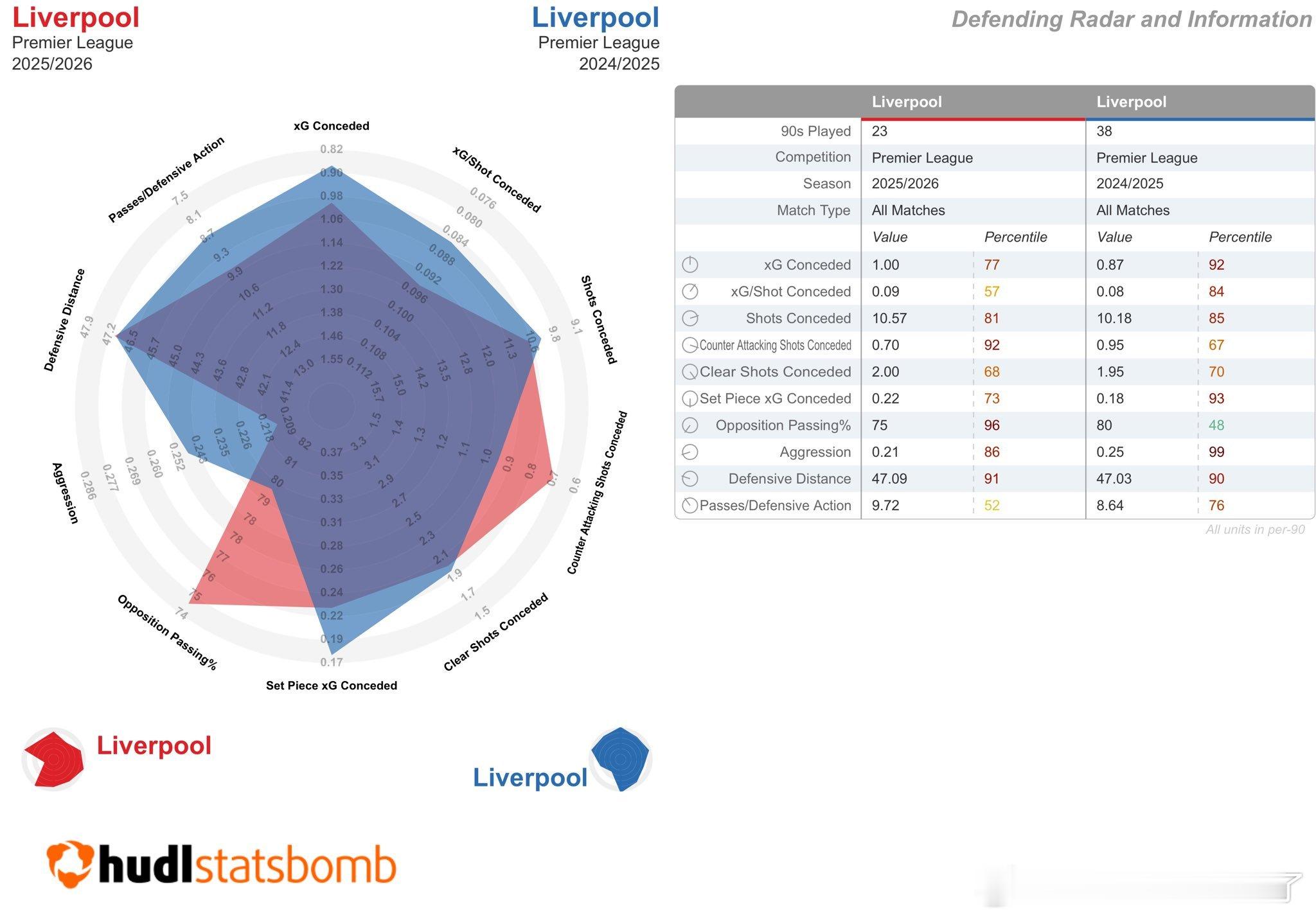 再度分析利物浦的定位球防守(但个人认为这样的分析,没有了固定的防守戈麦斯或者科纳特保护后点,所以防守站位又 )卡拉格对利物浦定位球布防的质疑完全合理——尤其是对阵伯恩茅斯时,进攻角球中关键位置的人员安排确实值得商榷。需注意:利物浦防守角球的阵型安排,在解雇·布里格斯之前与之后并无变化。可参考下图对阵利兹联(客场)与伯恩茅斯(客场)的站位对比:第一区域:一名高前锋(埃基蒂克 或者伊萨克)第二区域:范迪克第三区域:另一名中卫第四区域:格拉文贝赫(各区域均配备阻挡球员)我向来不认同网络上对布里格斯被解雇前后的集体指责。此前某些言论声称“主教练不应担责”,这在我看来十分荒谬。如同所有教练组成员一样,斯洛特是金字塔顶端,最终决定权在他手中。教练团队提交方案,由斯洛特拍板执行。解雇布里格斯后利物浦的角球防守数据确有改善,但这混淆了相关性与因果关系。根据 数据,利物浦25/26赛季与24/25赛季的防守基础数据对比如下图4所示:关于防守定位球的预期进球(xG)雷达图标注:🔴 24/25赛季:场均0.18值(超过93%的球队)🔴 25/26赛季:场均0.22值(超过73%的球队)虽实现20%的赛季同比提升,但实际差异并不显著——近期的改善更可能源于数据波动和均值回归,而非单一变量导致。利物浦在定位球的攻防体系构建上仍需持续优化,特别是在淘汰赛制的杯赛中,定位球将成为决定性因素。两个禁区内皆有巨大提升空间,这绝非仅靠解雇布里格斯就能彻底解决的问题。