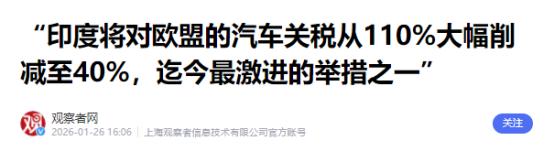 果然被我说中了! 印度突然宣布: 1月25日,印度与欧盟宣布正式达成贸易协议,同意将汽车进口关税从惊人的最高110%立即下调至40%,并计划逐步降至10%。 这次协议其实就是印度给欧洲高端燃油车开了一扇窗,但同时也把自家电动车市场保护得结结实实,让人不得不佩服印度的“小算盘”打得相当精明。 欧盟那边的高端车企估计都快笑疯了,尤其是宝马、奔驰、大众这几家大佬,之前在印度市场因为那110%的天价关税,卖一辆车比登天还难,有时候定价都快赶上国内售价的三倍了,根本没多少人买得起。现在关税直接砍到40%,等于成本一下子降了一大截,以后在印度卖高端燃油车终于能正经赚钱了。 之前印度对进口整车收那么高关税,说白了就是想护着本土车企,但本土燃油车产业其实一直没起来,市场份额大多被丰田、本田这些日系车占了,欧洲高端燃油车根本插不进来。而且印度之前还经常给外资车企开“天价税单”,就说大众吧,去年刚被印度税务部门追缴14亿美元税款,理由是说它用“零部件分批进口”规避关税,搞得大众在印度的供应链都快断了,50多批零配件被海关扣着放不出来。现在突然降关税,说白了就是印度想通了,与其抱着高关税挡着别人,不如放欧洲高端燃油车进来,还能换点实在好处。 最绝的是印度把电动车排除在了降税清单之外,头五年压根不让电动车享受关税优惠,这波操作直接把本土电动车产业护在了温室里。印度本土的塔塔、马恒达这两家电动车企业,最近两年正在发力扩产,印度政府还专门出台了电动车政策,要求外资车企想进印度电动车市场,必须投资至少5亿美元,3年内建好工厂,5年内实现50%的本土零部件采购。就像特斯拉,之前一直抱怨印度电动车关税太高,想进去却始终没门,这次协议一签,特斯拉估计更懵了,燃油车关税降了,电动车关税却纹丝不动,明摆着印度不想让外资电动车抢本土企业的饭碗。 其实这协议也不是一拍脑袋成的,印度和欧盟从2007年就开始谈自贸协定了,谈了十几年一直卡在那,分歧一大堆,比如农产品准入、知识产权这些问题,吵来吵去没个结果。2022年重新启动谈判后,进度也一直慢悠悠的,直到最近美国给的压力太大,才逼着双方加快了脚步。美国不光对欧盟加征15%的平均关税,对印度也没手下留情,还以印度帮俄罗斯出口能源为由追加关税,欧盟和印度被逼得没办法,只能抱团取暖,赶紧把这份贸易协定敲定。 欧盟这边也有自己的小九九,印度有14亿人口,高端汽车市场潜力大得很,之前因为高关税进不去,现在终于有了突破口,欧盟委员会主席冯德莱恩都直言,这能让欧盟获得有史以来最高水平的印度市场准入,还预计欧盟对印度的出口能翻倍。不过欧盟也妥协了不少,像农产品贸易这种关键问题,双方到现在都没谈拢,只能先搁置着,还有欧盟的碳边境税,本来对印度钢铁、铝出口影响很大,这次也没在协议里深究,等于欧盟为了打开印度汽车市场,暂时放弃了一些诉求。 印度这波操作是真的会算,表面上让了步,把燃油车关税降了,实际上把核心的电动车市场护得严严实实。要知道现在全球都在搞电动车转型,印度也想抓住这个风口,让本土电动车企业起来,等以后塔塔、马恒达这些企业站稳脚跟了,技术和产能都跟上了,再慢慢考虑电动车关税的问题,到时候主动权就全在印度手里了。而且印度降关税也不是所有燃油车都降,只针对价格超过1.5万欧元的高端车型,普通家用燃油车关税没怎么动,对本土低端燃油车产业也没多大影响。 现在协议就等1月27日欧盟-印度峰会正式宣布了,双方虽然还有不少悬而未决的问题,但单就汽车关税这一项,印度就赢麻了。既讨好了欧盟,换来了其他领域的合作可能,又保住了本土电动车产业的发展机会,还能靠欧洲高端燃油车的进入带动一下本土汽车产业链,比如零部件配套这些。不得不说,印度这次是把“借力打力”玩明白了,看似让步的背后,全是精打细算的考量,比之前硬靠高关税保护产业的笨办法高明多了,以后欧盟和印度的贸易往来,估计会因为这份协议热闹不少。
