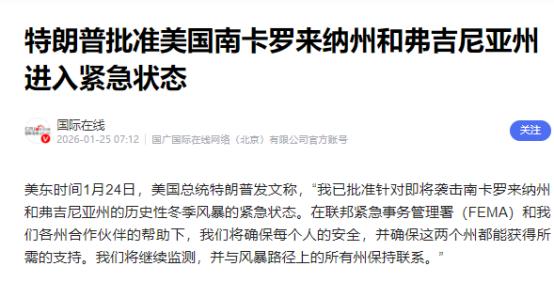 美东时间1月24日,美国总统特朗普发文称,“我已批准针对即将袭击南卡罗来纳州和弗吉尼亚州的历史性冬季风暴的紧急状态。在联邦紧急事务管理署(FEMA)和我们各州合作伙伴的帮助下,我们将确保每个人的安全,并确保这两个州都能获得所需的支持。我们将继续监测,并与风暴路径上的所有州保持联系。” 美国国家气象局23日说,一场大规模冬季风暴将从当天晚间起席卷美国大部分地区,给多地带来强降雪等极端天气。目前美国全国已有约1.7亿人处于极端天气警报覆盖范围内。周末两天,美国全国已有超9000架次航班被取消,且有持续上升趋势。 接着局势就超出了最初那两个州的范围,这场被命名为“费恩”的风暴一路横扫,影响范围横跨美国三千多公里,直接波及三分之二的国土,成了近些年规模数一数二的冬季灾害。特朗普的紧急状态授权也跟着扩容,不光南卡和弗吉尼亚,后续又追加批准了田纳西、佐治亚、马里兰等十个州进入紧急状态,算上其他州自行宣布的,全美最终有21个州陷入紧急状态,得州甚至直接把134个县划入灾难状态。 航班取消潮到25日彻底失控,根据航班追踪网站的数据,当天单日出取消量就突破一万架次,最终定格在10485架次,再加上前几天的取消量,累计受影响的航班超过2.85万架次。华盛顿里根国家机场的取消率几乎达到百分之百,纽约拉瓜迪亚机场、费城国际机场也没能幸免,取消率都超九成,大量旅客被滞留在机场,手里的机票直接变成了废纸,想改签都没多余航班可选。 地面上的麻烦一点不比空中少,极端低温和降雪叠加,让不少道路结冰封路,能见度低到看不清前方路况,官方一个劲提醒民众非必要不外出。电力系统更是扛不住冲击,全美有超过90万用户遭遇断电,南部的田纳西州、密西西比州等几个州受影响最严重,不少家庭在零下十几度的严寒里断了取暖来源。为了避免重蹈2021年得州电网瘫痪的覆辙,电力部门从37个州调来了五万多名工人提前布防,还临时授权电网运营商调用工厂、数据中心的备用发电机,才算勉强稳住局面。 民众也开始疯抢物资,得州达拉斯一家杂货店的货架被扫得干干净净,水、鸡蛋、黄油、肉馅这些生活必需品全被抢空,不少人抱着“囤够三天货”的想法疯囤,生怕后续断供。针对行动不便的群体,美国红十字会开设了125个以上的取暖中心和庇护所,南卡罗来纳州还专门设了医疗设备电力庇护所,供依赖氧气机、透析仪的民众应急使用,有需求的人打专门热线就能申请支持。 更离谱的是,这种人命关天的时刻,相关部门居然还在纠结用词问题。有知情人士爆料,官员私下要求FEMA发布预警时尽量避开“ice(冰)”这个词,就怕民众把“路面结冰”的提醒和移民与海关执法局(ICE)联系起来,变成嘲讽或抗议的素材。天气预报员只能被迫改用“冻雨”这类说法,这种掩耳盗铃的操作在内部引发强烈反弹,不少人吐槽,为了避政治嫌隙放弃精准表述,只会让民众更难判断风险,反而增加危险。 不同地区的应对也透着明显差异,南部各州因为平时少见极端低温,应对能力相对薄弱,只能靠提前宣告紧急状态、呼吁民众囤货自保;北部的纽约、明尼苏达等州就熟练得多,纽约提前部署了数千名环卫工人和除雪车,明尼苏达在气温跌至零下46摄氏度左右时,重点提醒民众防范失温风险。中国驻芝加哥总领事馆也及时发声,提醒领区华侨华人、留学生减少外出,做好保暖和应急准备。 这场风暴不光是对自然的抗争,更暴露了美国应急体系的短板,得州独立于全国的电网、老化的基础设施,还有关键时刻被政治干扰的预警工作,都让这场灾害的影响雪上加霜。截至目前,风暴已经造成多人死亡,FEMA还在和各州协同监测,只是对于被滞留、被断电的民众来说,这场寒冬里的麻烦,显然还没那么快结束。