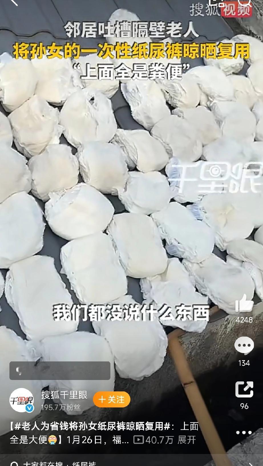 这可不是节约, 这是又自私又懒! 福建宁德一位林女士晒出邻居的阳台,简直让人吃惊,密密麻麻摆了一大片纸尿裤,还是用过的,有的上面还粘着大便。 原来邻居家有一个小孙女,老人觉得孩子一天拉太多次,纸尿裤用着浪费,便打算晒晒重新使用。 邻居说了很多次这样做不好,老人不为所动,还是接着晒。 真是让人无语又头痛。 这可不是节约,而是自私又懒惰, 真正疼爱孩子就不会让孩子重复实用尿裤, 真正想节约就该用更便宜的尿布。 这是既有了纸尿裤的方便,又省了洗尿布的麻烦,唯一的伤害全给了无辜的孩子。