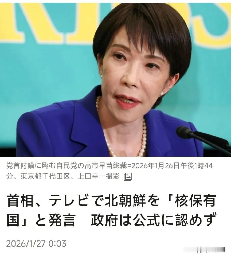 高市早苗言论再次引发争议。日本首相高市早苗在电视上称朝鲜为"核大国",但日本政府并未正式承认这一点。1月26日晚,高市早苗与各政党领导人一同出现在朝日电视台新闻节目中。在提及朝鲜、中国和俄罗斯时,高市早苗说:“它们都是核大国。”然而,日本政府官方并不承认朝鲜是“核大国”。 评几句: 高市早苗不当表态,绝非口误这般简单 一句不当表态,直接戳破日本政府的官方立场矛盾!朝日电视台节目中,高市早苗竟将朝鲜与中俄并列称作“核大国”,可日本官方从未承认这一说法,首相表态与政府官方立场截然相反,尽显日本政坛的立场混乱。 这绝非无心口误,而是极右翼的刻意政治算计!高市一贯靠渲染地区安全焦虑制造政治噱头,一边炒作朝鲜核问题,一边暗戳戳触碰日本“无核三原则”,其目的就是为日本扩军找借口。硬将朝鲜抬为“核大国”,本质是放大地区紧张,借机裹挟民意,推动防卫预算上调,背后的政治图谋昭然若揭。 更显双标的是,日方对自身历史问题避而不谈,却肆意给邻国贴标签,一边炒作他国防务话题,一边不断突破自身防务底线,试图动摇无核三原则。高市的此番言论,不仅让日本外交陷入被动,更是持续触碰东北亚地区的安全红线。 罔顾事实的政治操弄,终究无法得逞。挑动地区对立换不来自身安全,这般肆意制造地区焦虑的政治操作,只会让日本在国际社会越走越偏,最终只能自食恶果!