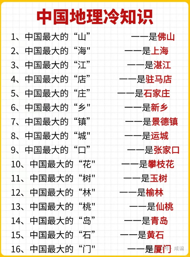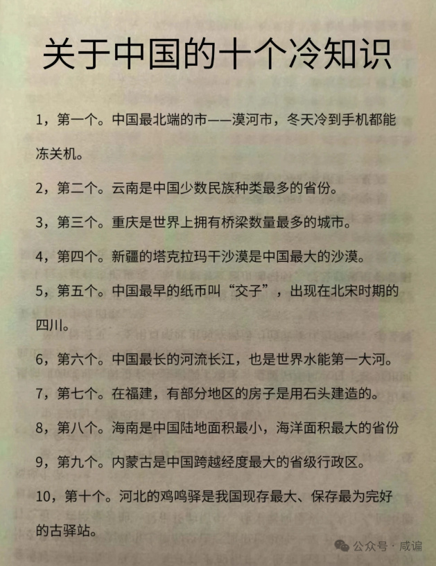 关于中国的十个地理冷知识,你知道几个?1,第一个。中国最北端的市——漠河市,冬天冷到手机都能冻关机。 2,第二个。云南是中国少数民族种类最多的省份。 3,第三个。重庆是世界上拥有桥梁数量最多的城市。 4,第四个。新疆的塔克拉玛干沙漠是中国最大的沙漠。 5,第五个。中国最早的纸币叫“交子”,出现在北宋时期的四川。 6,第六个。中国最长的河流长江,也是世界水能第一大河。 7,第七个。在福建,有部分地区的房子是用石头建造的。 8,第八个。海南是中国陆地面积最小,海洋面积最大的省份。9,第九个。内蒙古是中国跨越经度最大的省级行政区。 10,第十个。河北的鸡鸣驿是我国现存最大、保存最为完好的古驿站。