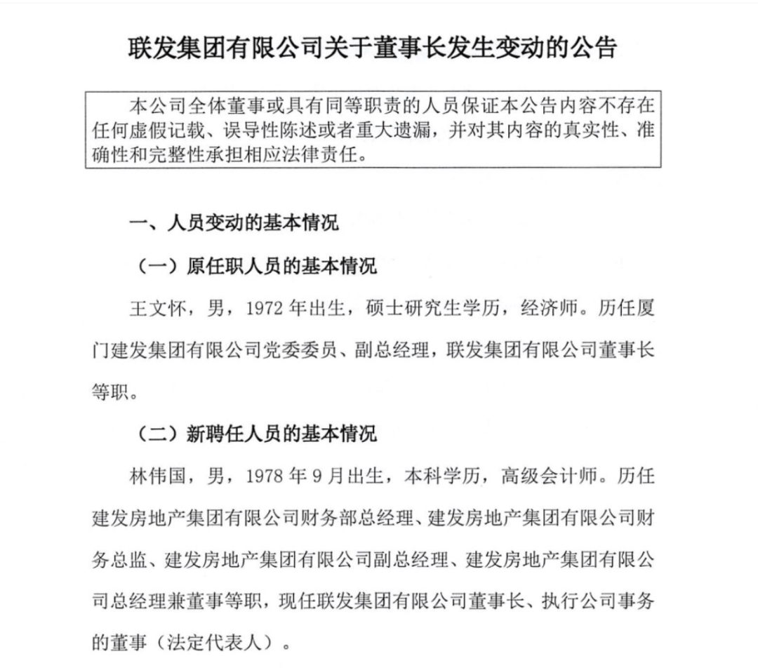 根据联发集团公告,经公司董事会审议通过,聘任林伟国为公司董事长、执行公司事务的董事(法定代表人),王文怀不再担任公司董事、董事长职务。