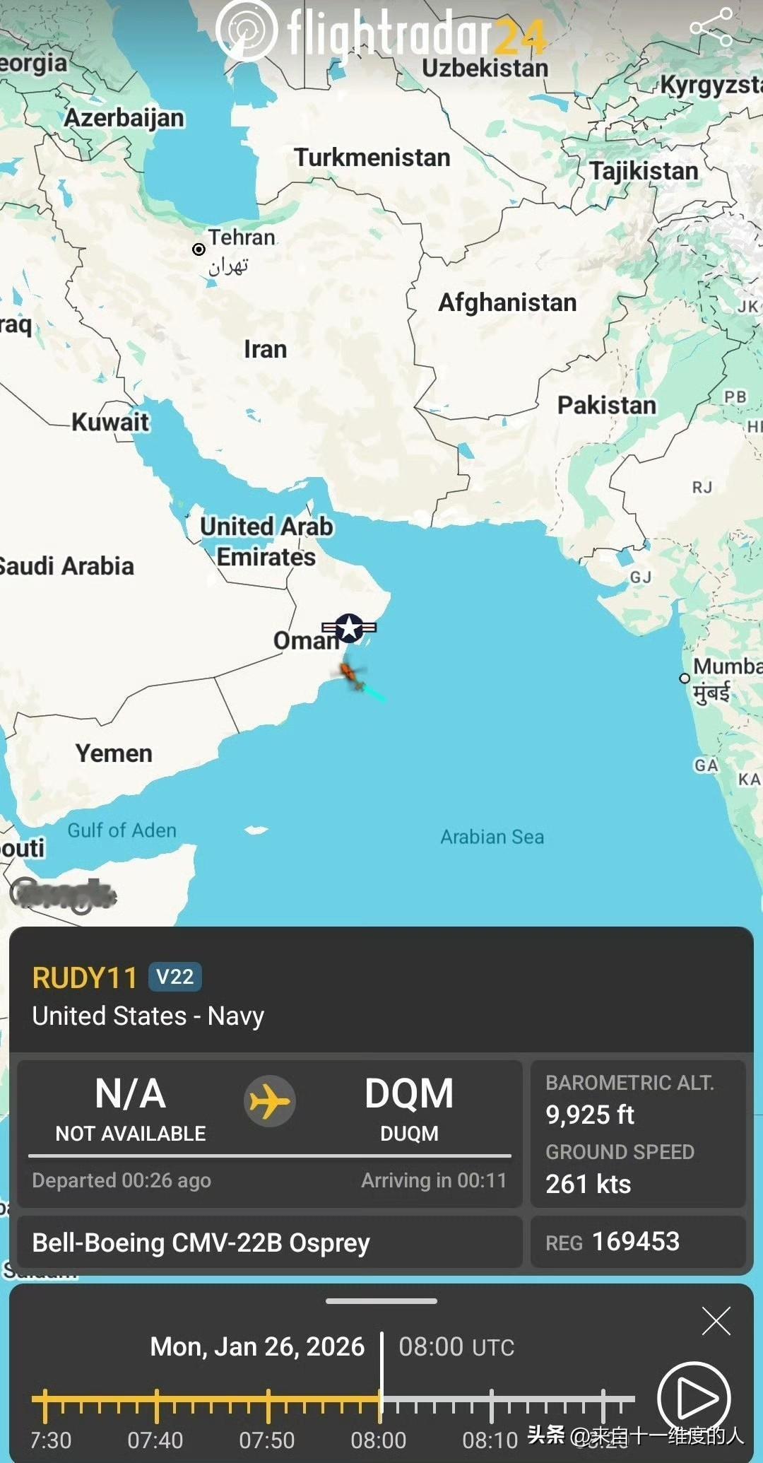林肯号上一架编号169453的CMV-22B倾转旋翼机暴露了航母编队目前的大概位置,已经抵达阿曼海岸附近,与伊朗保持770多公里的距离。 刚好,伊朗官方公布的新款“佐勒菲卡尔·巴希尔”反舰弹道导弹的射程刚好就是700公里,林肯号这个距离显然就是担心这款导弹发起突袭吧! 林肯号航母