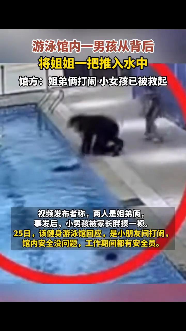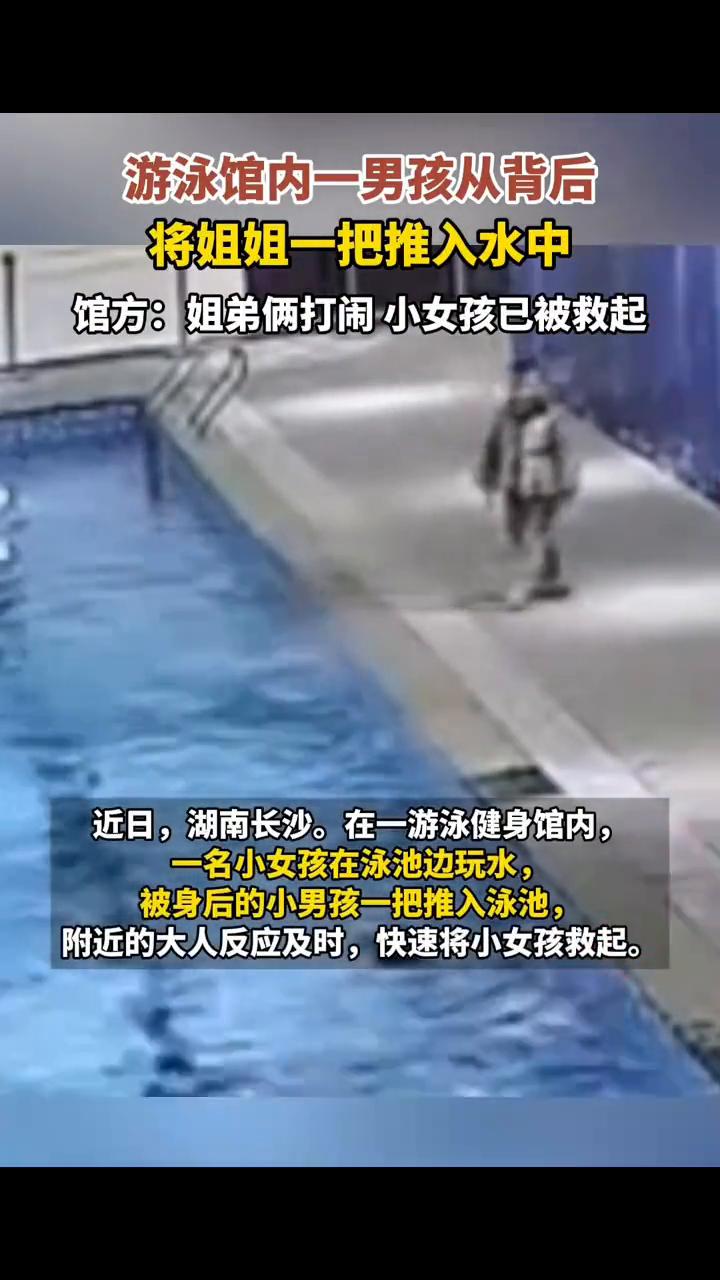 游泳馆内一男孩从背后将姐姐一把推入水中。 馆方:姐弟俩打闹,小女孩已被救起。 近日,湖南长沙。在一游泳健身馆内,一名小女孩在泳池边玩水,被身后的小男孩一把推入泳池,附近的大人反应及时,快速将小女孩救起。 视频发布者称,两人是姐弟俩,事发后,小男孩被家长胖揍一顿。25日,该健身游泳馆回应,是小朋友间打闹,馆内安全没问题,工作期间都有安全员。