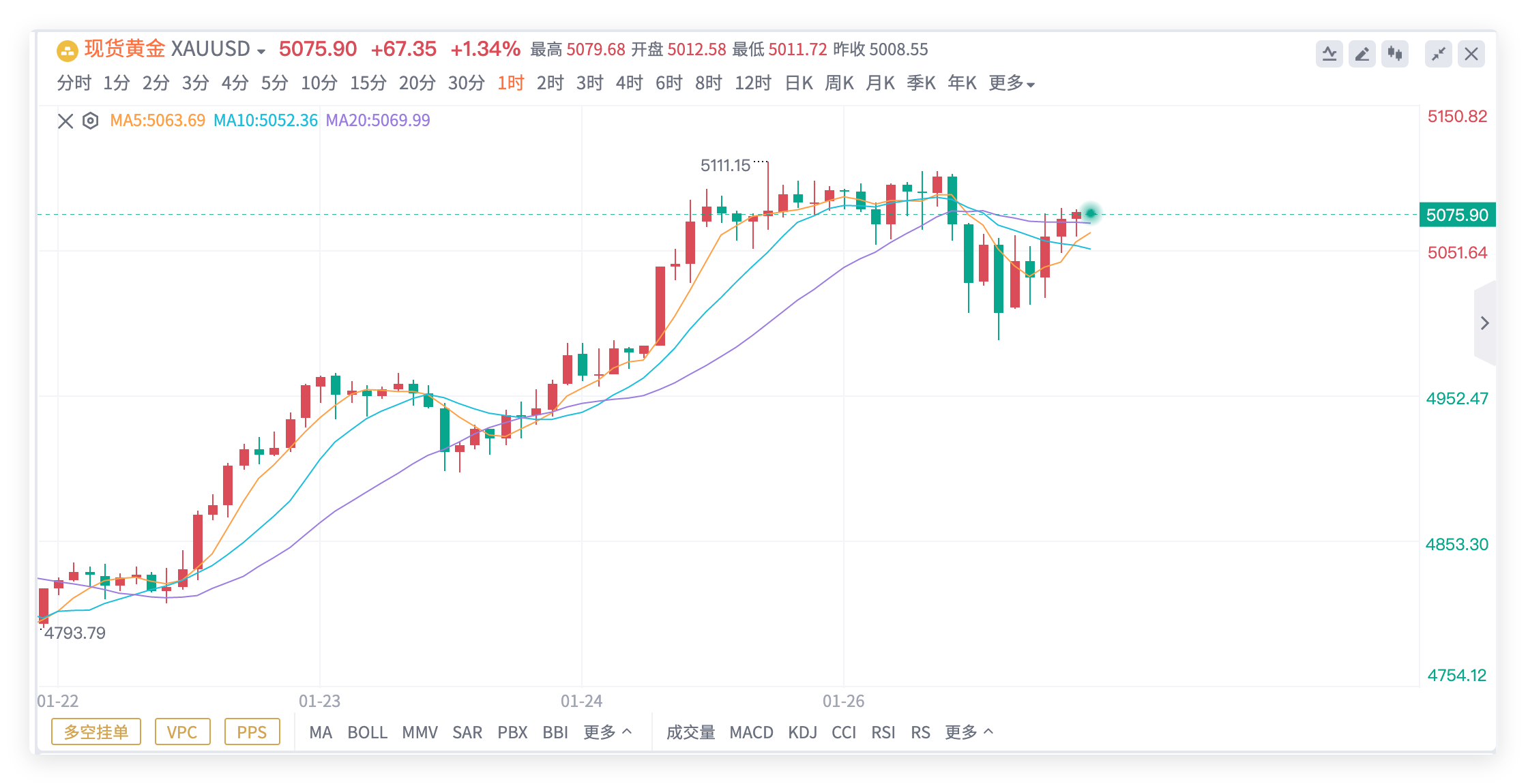 看涨不变,早盘先关注5088阻力如我们昨晚欧盘时段的分析,黄金在无法创出新高的情况下回调,低点4990也在预估之内,此低点也弥补了当日的高开缺口。今天(1月27日)黄金价格继续高开,但走势较昨天有明显减弱,很快美联储将进行议息会议,市场预计将保持利率不变。从技术层面来看,当前金价于15分钟图表中表现强势,MACD有突破零轴的迹象,尽管目前成交量还未扩张,但刚才的反弹是从该级别布林带中轨处启动,短线可能会先触目5088(昨天早盘的第一压力位)。操作上我们继续关注5100-5111的昨日高点阻力,预计不会一蹴而就,多单进场点继续参考5050-40一线。黄金金价黄金白银大回调