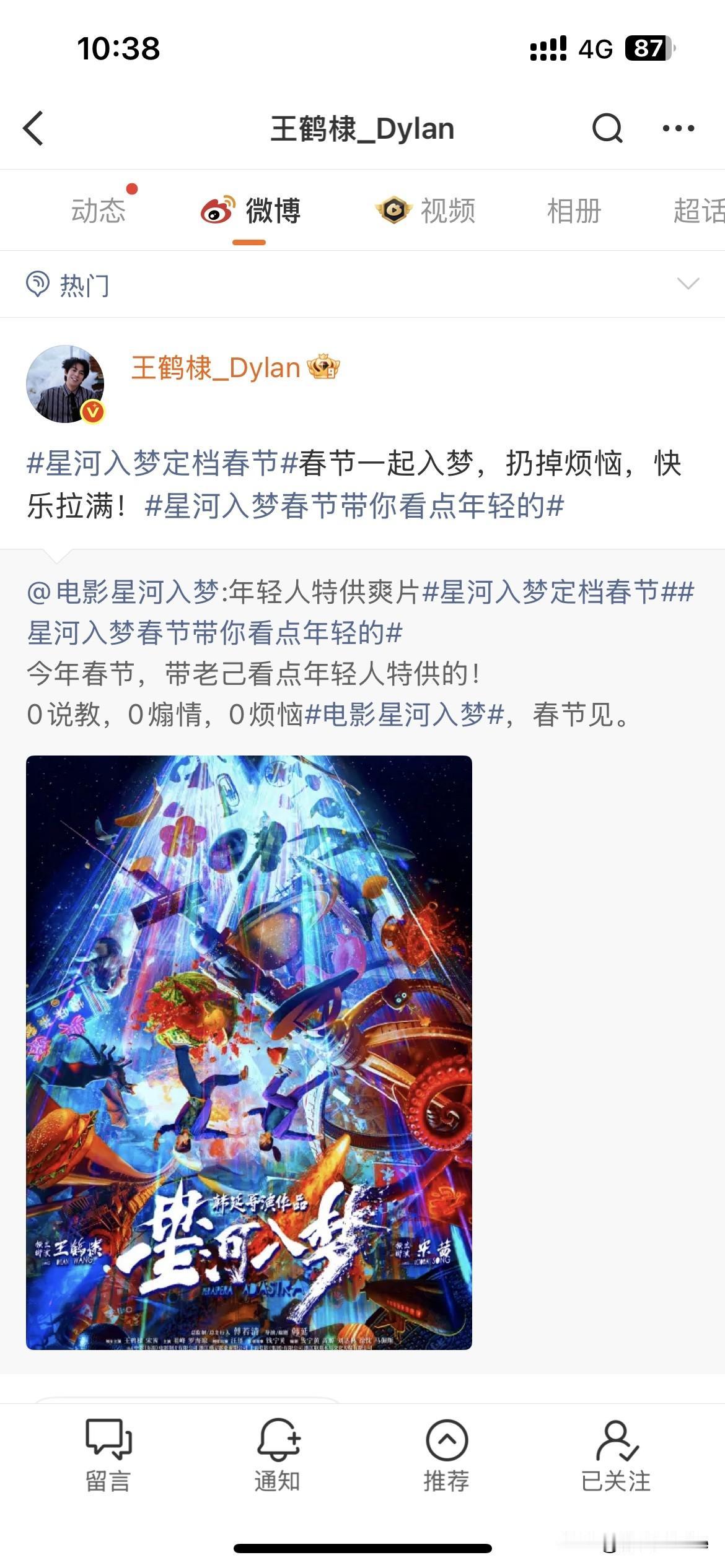 1月27日,王鹤棣《星河入梦》定档,首部一番电影入驻春节档,博一博单车变摩托! 是目前读者很喜欢的快穿题材,加入了很多鬼马无厘头搞笑元素,剧情很荒诞,适合不做任何准备,直接进电影院看的一部电影! 片方给出的宣传点是0说教,0煽情,0烦恼,年轻人特供爽片,这标签挺大胆的,有种初生牛犊不怕虎的感觉,不怕得罪常驻老大哥们,这部电影也是喜剧,跟飞驰人生撞型,属于在老大哥手里抢饭吃,刺激,期待! 大部分人还是会先看飞驰人生,星河入梦看前三天评价再决定!所以前三天很重要!