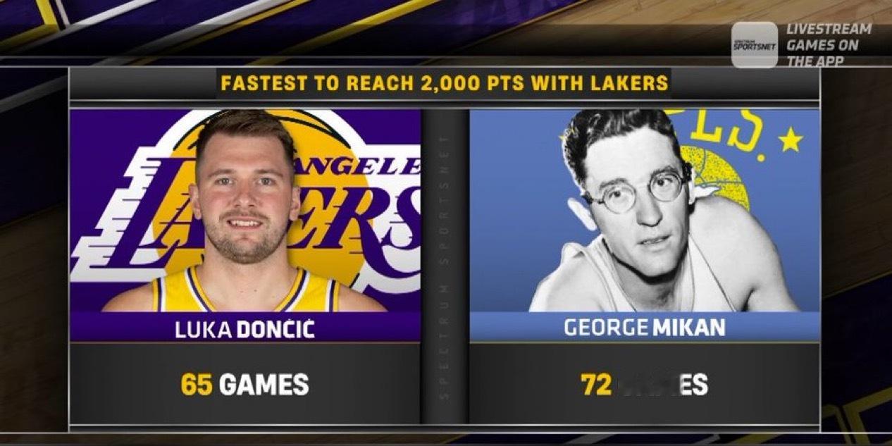 东契奇成为湖人队史最快达到2000分的球员,只用了65场,乔治麦肯用了72场。