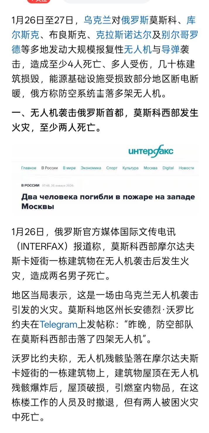 回旋镖? 大概在大鹅对乌克兰的战争的很早的时候,大鹅就好像开始对乌克兰的基础能源供应设施设备,进行大规模的、反复的和长期的空中袭击,不断的爆炸和破坏,使乌克兰经常发生断电、断水和在冬季断暖。大鹅的动机可能就是,为乌克兰人制造很多生活困难,他们就会屈服、顺从。结果,战争马上就已经到了第四个年头了,乌克兰人不仅仅是没有被断电、断水和断暖的重重困难所吓倒,吓的如同大鹅希望的那样,屈膝投降,俯首称臣,举着旗帜欢迎大鹅军,反而大概是浴血奋战,并且越战越勇,军事力量也似乎越来越强大。 现在又是一个深冬季节,大鹅对乌克兰的基础能源供应设施设备的袭击,却招到了乌克兰强烈的反击。除了之前乌克兰袭击俄罗斯的别尔哥罗德等地,造成大面积的断电、断水和断暖之外,根据网络上的消息,1月26日(昨天)到今天早些时候,乌克兰又袭击了俄罗斯首都莫斯科、布良斯克、库尔斯克和克拉斯诺达尔等地区,并且同样造成一些地区的基础能源供应设施设备损毁,电、水和暖供应不得不因此中断。 切记,无缘无故,或者没有任何充足的理由去打别人,在很多的时候,实际上就是在变相打自己。