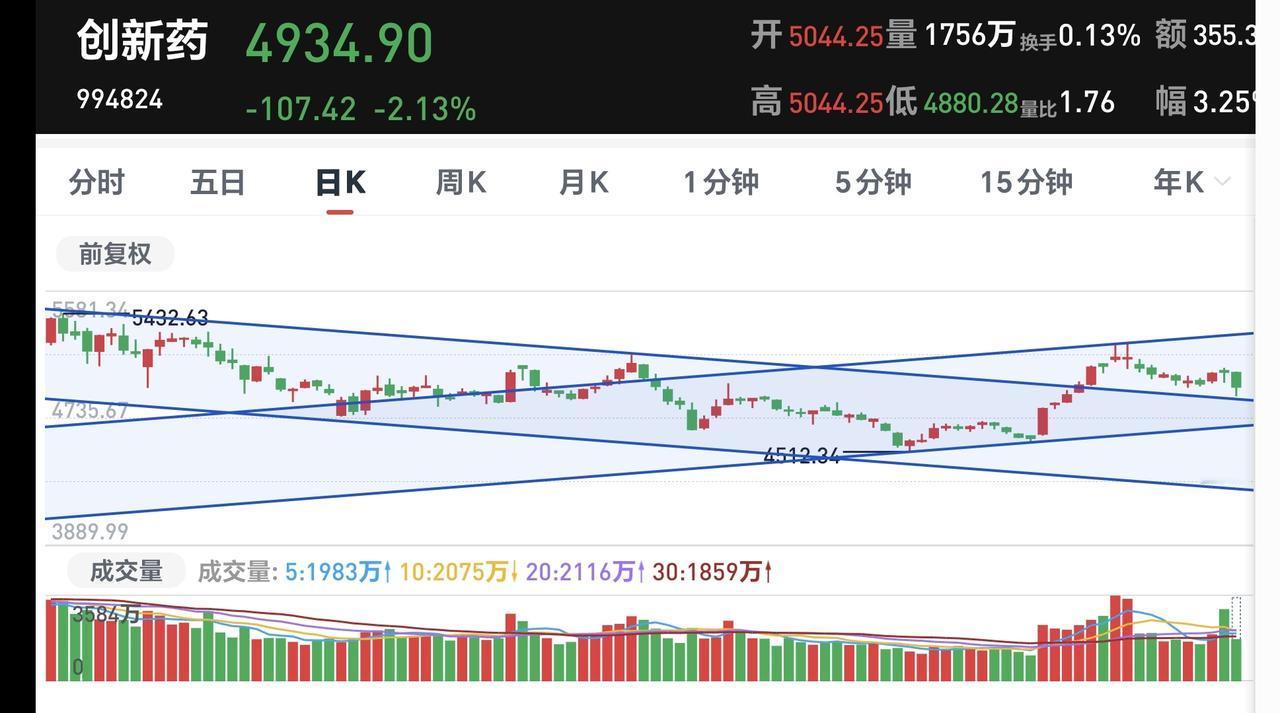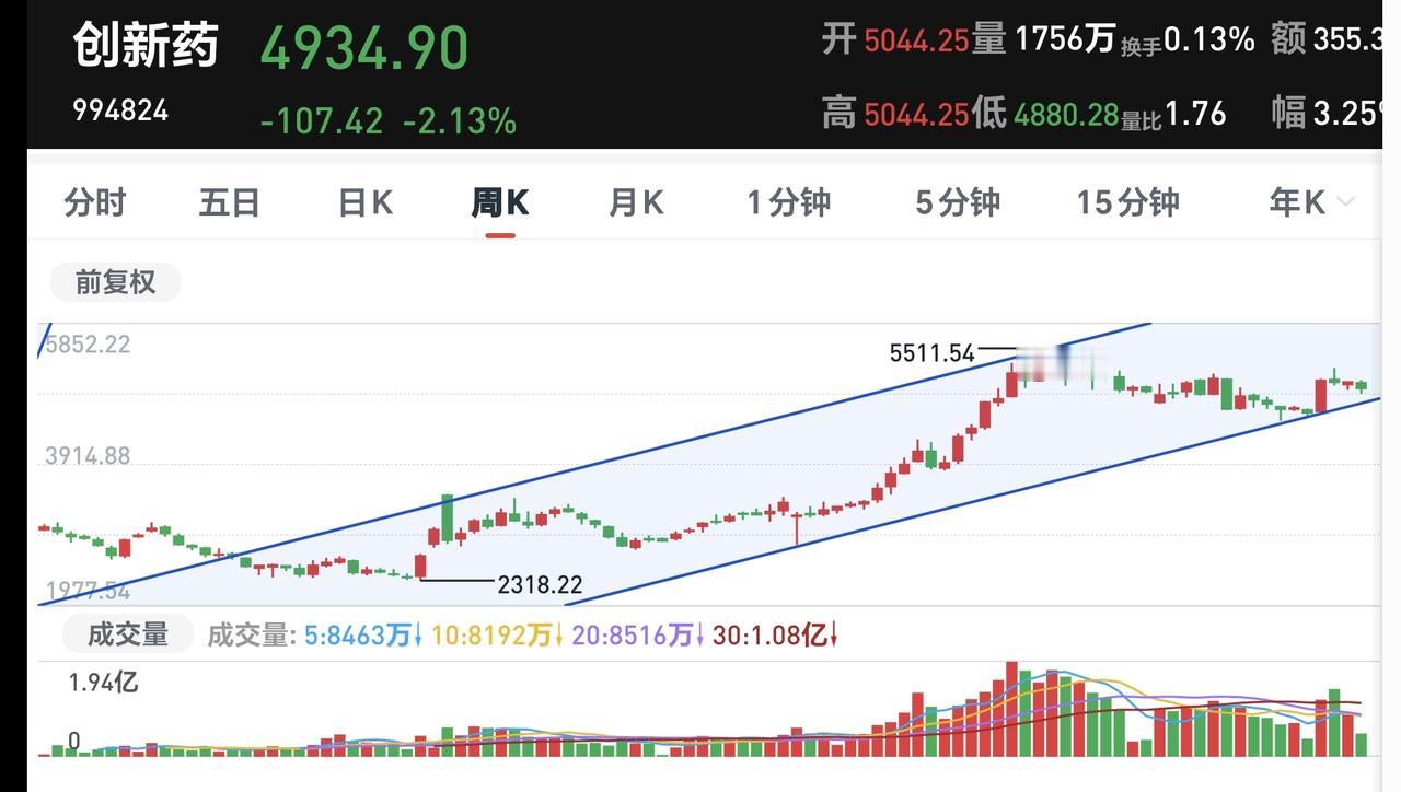 基金:创新药板块应该怎么办 持有的创新药板块基金富国,中午收盘的时候估值下跌了1.23%,持有收益率也只剩下了13%多一点,创新药板块估值下跌了0.37%,是连续第二个交易日下跌,这个板块的持有人数在所有板块当中排名第9位,里面的散户也不少。 这个板块今天加仓排行榜见下面的截图5,持有人数排行榜见下面的截图6,排名第一的都是永赢医药创新智选混合。 看下面的截图7,这是创新药板块日K线图,前段时间上涨突破了下跌通道的上轨,最近是突破以后的冲高回落,我今天又画了两条倾斜向上的斜线,这是创新药板块日线级别短期上涨通道,如果后期跌破这个短期上涨通道的下轨线,就确定前段时间的突破是假突破。 看下面的截图8,这是创新药板块周K线图,今天对这个上涨通道的下轨线进行了位置调整,我认为今天这个画法会更好一些,在不跌破这个上涨通道下轨线的前提下,越靠近上涨通道下轨线的地方,越可以考虑要不要进场,如果跌破这个周线级别上涨通道的下轨线,不可以轻易进场。 我每天都会有观点,观点会不断的更新,因为市场的走势是不断变化,我根据市场的最新走势来做出判断,这并不是观点善变,是随着市场走势的变化而变化,是一种跟随性变化。 大家帮忙评论,点赞,转发和分享,谢谢大家的支持。