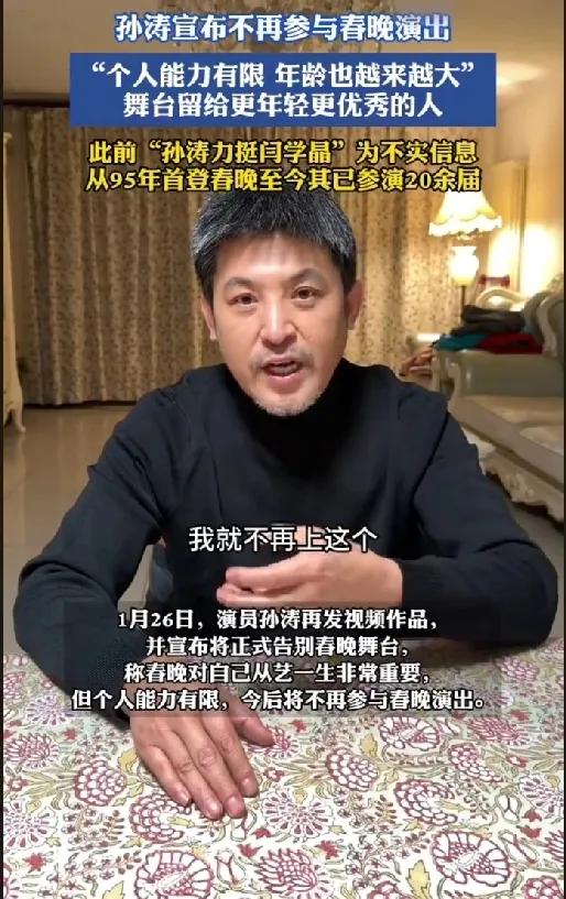 孙涛宣布告别春晚! 演员孙涛正式宣布将不再参与央视春晚。他在视频中感慨地说“总是有告别的那一天”,并想把机会留给年轻人。自1995年首登春晚,那句“我骄傲!”已成国民记忆。网友纷纷感谢他三十年来的陪伴。演员孙涛宣布将不再参与央视春晚 孙涛小品 孙涛闫学晶 孙涛直播间 孙涛