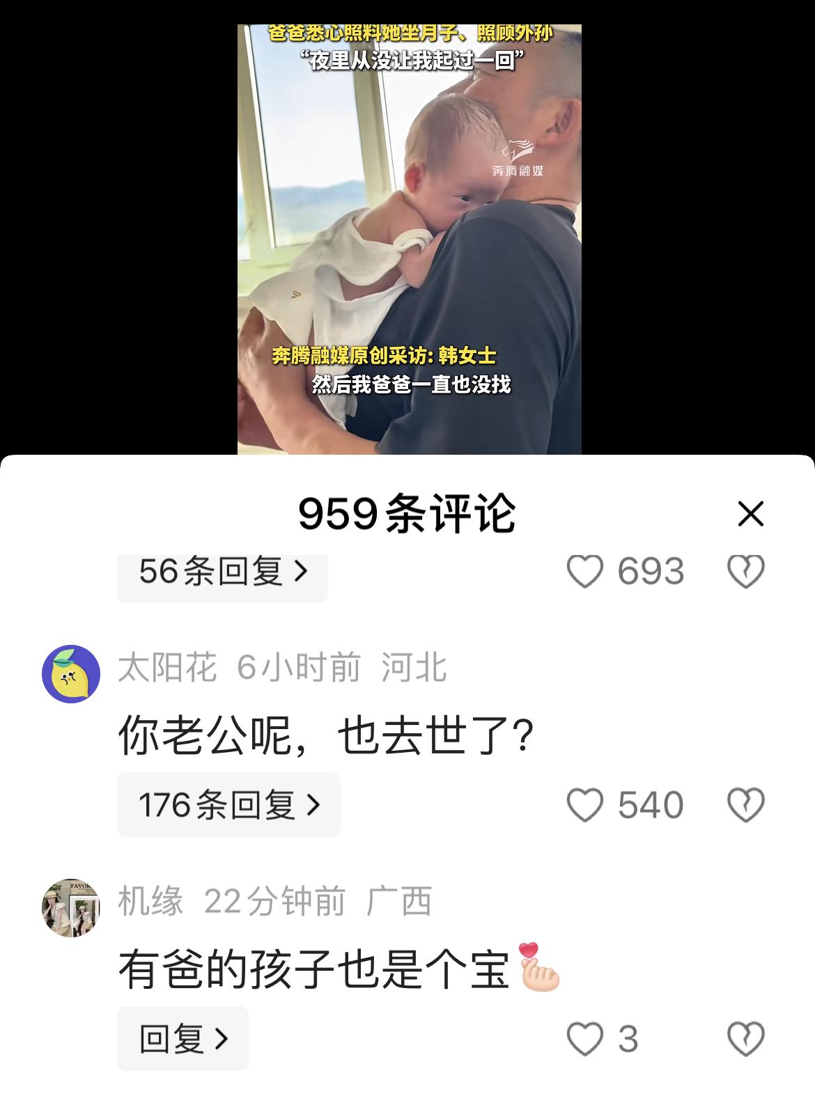 爸爸去哪儿了?与有爸的孩子是个宝? 女子坐月子,她妈妈已去世,女子的爸爸来照顾月子,并帮着带孩子,大家都在问:小宝宝的爸爸去哪了? 全国新生儿父亲陪产假基本在15天左右,多的可达30天,基本就是坐月子的时间,那么新手爸爸们休陪产假吗? 好多男士会说,现在压力那么大,哪敢请假,请假一个月,项目咋推进,工作谁来做,钱还怎么去挣?不挣钱,拿什么去坐月子呢? 现在,有钱人家坐月子去月子中心或者请月嫂,平常人家就是婆婆妈妈们帮忙,男人一般是默认不照顾月子,当然成了姥爷或爷爷又不一样,可以搭把手! 同事生孩子,老公请了两周假,生了孩子才3、4天,她婆婆就让她老公去上班,说大男人做不了这些。这应该是基本的社会现状! 其实,宝宝爸爸多带带孩子,不光可以体会育儿的辛苦,也可以让孩子更有安全感,性格更加开朗。不要欺负小宝宝不会问:爸爸去哪儿了?