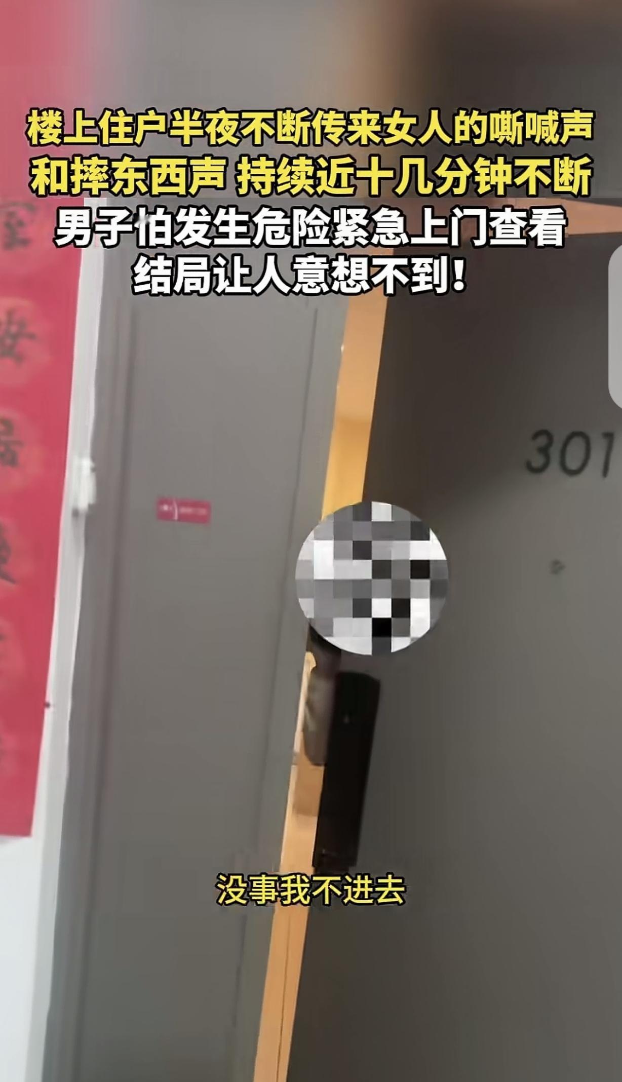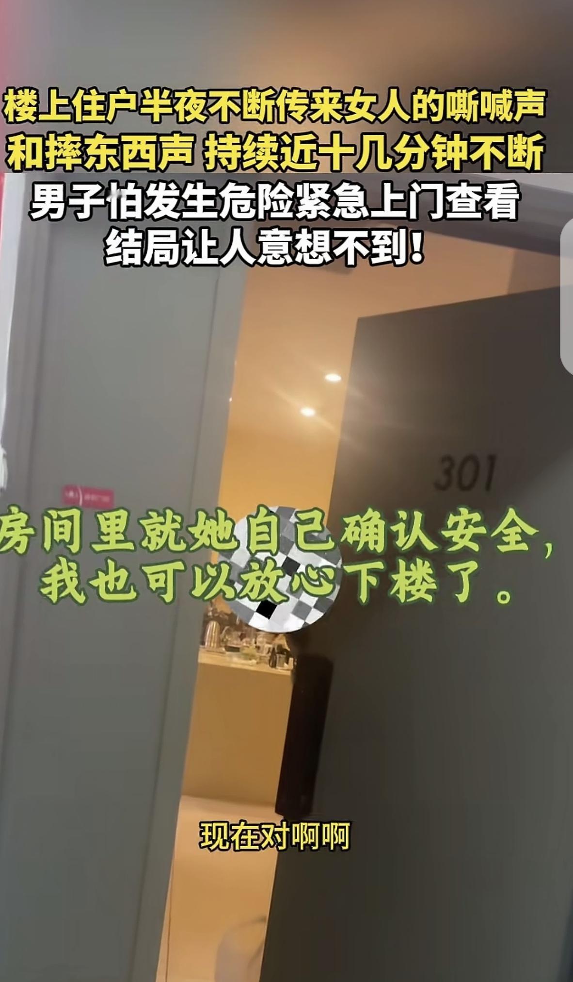 “真瘆人!”北京,一男子大半夜被吵醒,听到楼上不断传来女人的嘶喊声,这个喊叫太不正常了,还有摔东西声,持续了10多分钟,男子怕女子有危险,决定上楼查看,男子敲门口,房子里突然安静了,他赶紧问需要帮忙报警吗?结局让人意想不到。 一男子睡到半夜被惊醒,他凭息静听,楼上301传来女人的嘶吼声。 怎么形容这种声音呢,特别瘆人,特别绝望,歇斯底里,好像生命正面临严重威胁。 男子顿时汗毛直立,他本不想管,但接下来又传来摔东西的声音,持续了十多分钟,男子觉得,如果他再充耳不闻,事不关己高高挂起,那就太不男人了。 万一楼上的女人被人劫持,面临生死考验,自己袖手旁观,她出了事,他良心也过不去。 所以,男子决定上楼看看,他打定主意,如果女子遇到危险了,即使被丈夫打,是人家的家务事,他也要管到底,起码帮女子报个警,也算仁至义尽了,都说远亲不如近邻,这个好邻居他当定了。 于是,男子打开手机录像,一步步从楼梯走到楼上,301房间里女人的嘶吼此起彼伏,越靠近越让人心惊胆颤。 男子走到门口,把耳朵贴在门边侧耳倾听,就为了确认一下,别是自己出现幻听,大半夜闹个乌龙。 没错,声音就是从房间里传出来的,男子敲了敲门,不料,房间里的声音戛然而止,变得非常安静,男子更加确定,里面一定发生不好的事情。 男子做好了最坏的打算,哪怕自己卷进危险里,他也在所不辞,哪怕那是人家夫妻的家庭矛盾,他被女子丈夫打一顿,他也认了,谁让他是个热心肠呢! 男子继续敲门,房间里传来一个女人的声音:“谁呀?” 男子没说自己的身份,直截了当的问需要帮忙报警吗?女子声音很平稳,并没有恐惧,这让男子悬着的心稍微放了放。 女子继续说不用,男子追问:“没问题是吧?”,女子轻描淡写的说她在打电话,然后就不吭声了。 男子害怕是女子身边有人威胁她,让她这么说,他执意让女子开门,让他确认一下女子是安全的,只要她没问题,自己就下楼,毕竟她又砸又闹的,持续了这么久,不确认女子安全,他肯定报警。 女子一看,男子不好打发,还真开门了,开了一个缝,探出一个头来,男子要求女子把门再开大点,让她放心,自己不会进去,就是想看看她房间是不是有什么危险? 女子承认东西是她砸的,说自己在打电话,男子看对方没事,才转身离开。 这个结果,出乎男子的意料,他猜测,女子情绪不稳定,丈夫这么晚了不回家,女子歇斯底里在电话里跟丈夫发脾气,砸东西,惊扰四邻不安。 但有人却替这家男人打抱不平,一看就是女的发神经,这家男的真可怜。 有人觉得男子胆子真大,歇斯底里大发作?你居然还敢去敲门?刀你也白刀。 去年出差在济南,住公寓式酒店。半夜隔壁男女吵架,声嘶力竭,东西也摔了,男的也崩溃大喊,女的也在喊救命,我在犹豫要不要敲门看看的时候,突然没了声音,当时真怕女人被杀了。第二天退房的时候还专门问酒店是否发生了意外。如果真的有意外发生,自己会遗憾终生。 这才哪儿到哪儿?我家邻居一吵架都吵半宿,声音比这还大,帽子叔叔来了都没用。后来把房租出去打工去了,整栋楼消停多了!不会是我家邻居搬你们那个楼了吧? 以前租房时候,经常晚上听见隔壁女的大喊大叫别打我,打死我的,怕有啥事,去门口听了一会,结果是在…… 对此,你怎么看?