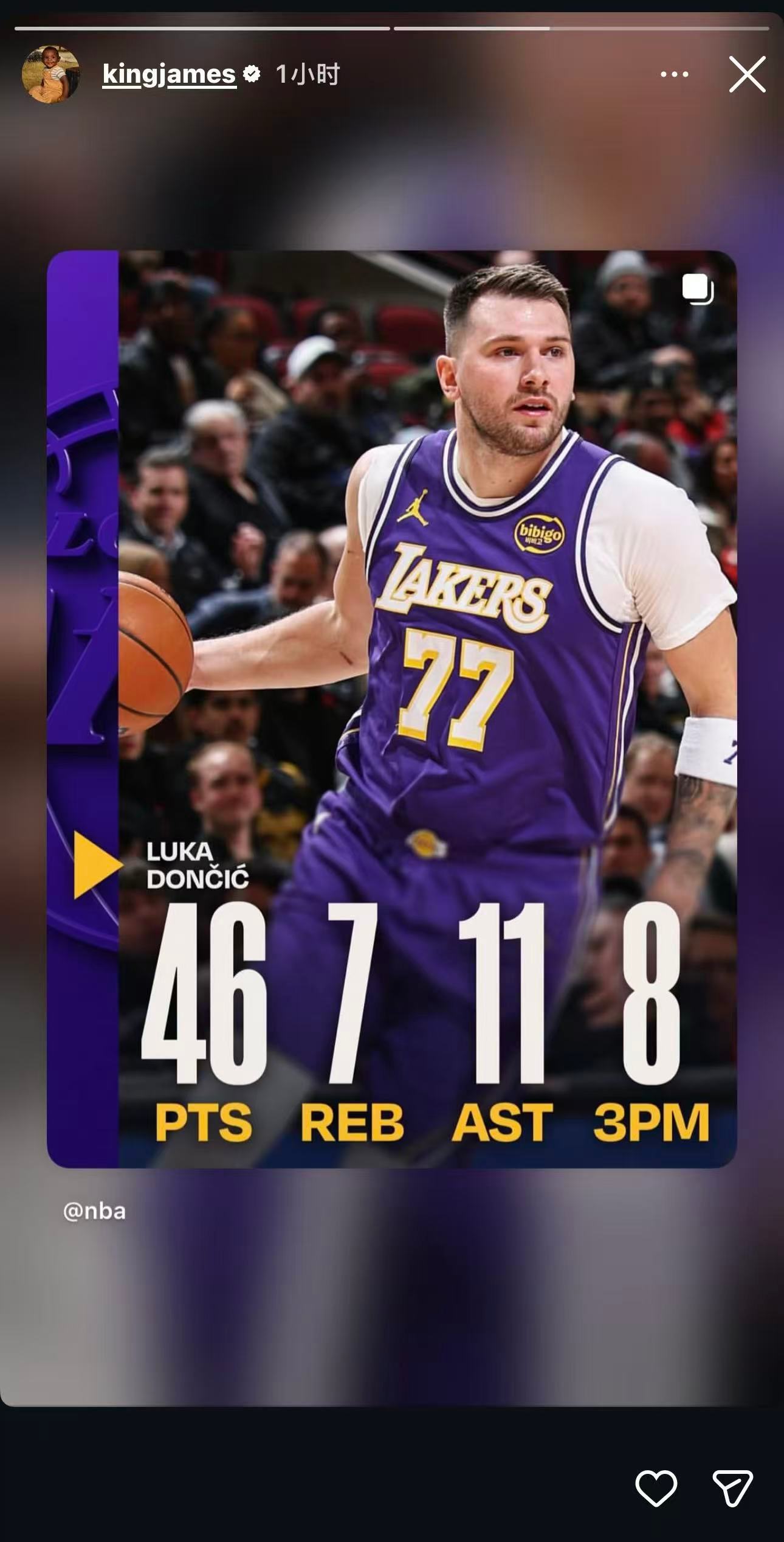 老詹更新IG动态,晒出东契奇今天数据46分11助攻7篮板8记三分,77最近的打法有调整,效果好多了!