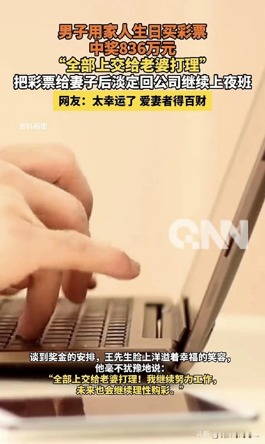800万砸中他,他却把彩票塞给老婆,继续上班。昨晚,佛山“淡定哥”王先生上了热搜。他第一反应不是辞职、不是环游世界,而是压低声音给老婆打电话:“咱中了,别太激动。” 接着,把彩票往媳妇手里一塞,转身回公司值夜班,留老婆一个人对着那张纸激动到通宵。 第二天,俩人开着小代步去兑奖,税后668万,一句“全部上交老婆打理”。 这哪是凡尔赛, 给所有普通人打了一针清醒剂。 对钱:不飘,知道横财是锦上添花,不是救命稻草;对伴侣:无条件信任,奖金全交=把后半生安全感打包给你;对工作:中800万该上的夜班一分钟不少。 800万,秒变669万 20%偶然所得税先砍掉167万,这是法律铁闸,谁都跑不了。真正到手669万,在佛山买套核心区学区房,再装修车位,已经去掉一半。所谓“财富自由”没那么容易。 把彩票交给老婆,是信任更是“避险” 法律上,彩票奖金属于夫妻共同财产;对比隔壁那些中奖先藏私房、离婚打官司的瓜 ,王先生这波“反套路”操作,简直给所有成年人上了一课,第一时间上交,既堵住家庭内讧的雷,也直接让“私房钱”这三个字失去意义。一句“全部给她打理”,是浪漫,更是风控。 云淡风轻坚持上班,才是最高级的“反杀” 很多人幻想“中大奖=立刻辞职”,可王先生,转身继续打卡、继续开会、继续挤地铁。他比谁都清楚,工作不只是工资,还是社会身份、节奏感、甚至自我价值。一下子闲下来,800万也可能变成“毁家三件套”:盲目理财、乱投资、被人借钱借到断亲。 用家人生日号,藏着最朴素的信仰 号码是女儿生日+结婚纪念日。看似玄学,其实是把“幸运”锚定在已有的幸福坐标上:钱可以天降,但爱必须生根。中了,全家锦上添花;不中,也提醒自己为何而战。 别把横财当本金,把它当保险。继续上班,就是继续把主动权握在自己手里;继续信任,就是给婚姻再加一道防火墙。800万只是让他们“更有底气地过原来的日子”,而不是“换种人生”。(图源网络)