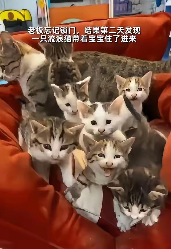 泪目了!超市大哥忘锁门,隔天竟发现沙发上窝着一家八口流浪猫,猫妈妈带着七个小奶猫