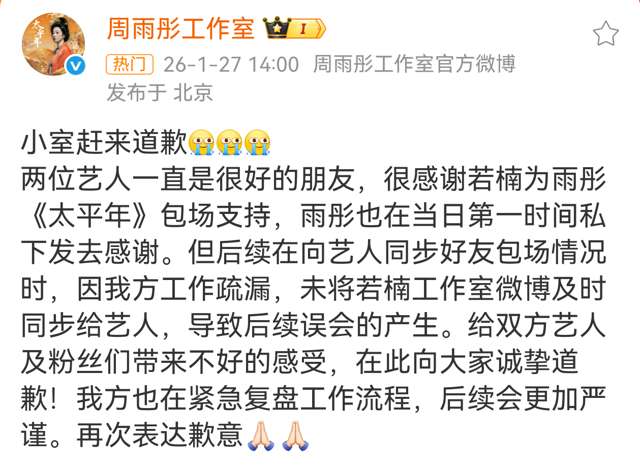 这个瓜大家吃了吗?我是没有想到到了工作室发文道歉的这一步。大概就是周雨彤新剧太平年开播,很多好朋友都包场支持,周雨彤在回复感谢的过程中漏了章若楠,现在周雨彤工作室道歉,大概就是这么一个事。 周雨彤工作室道歉
