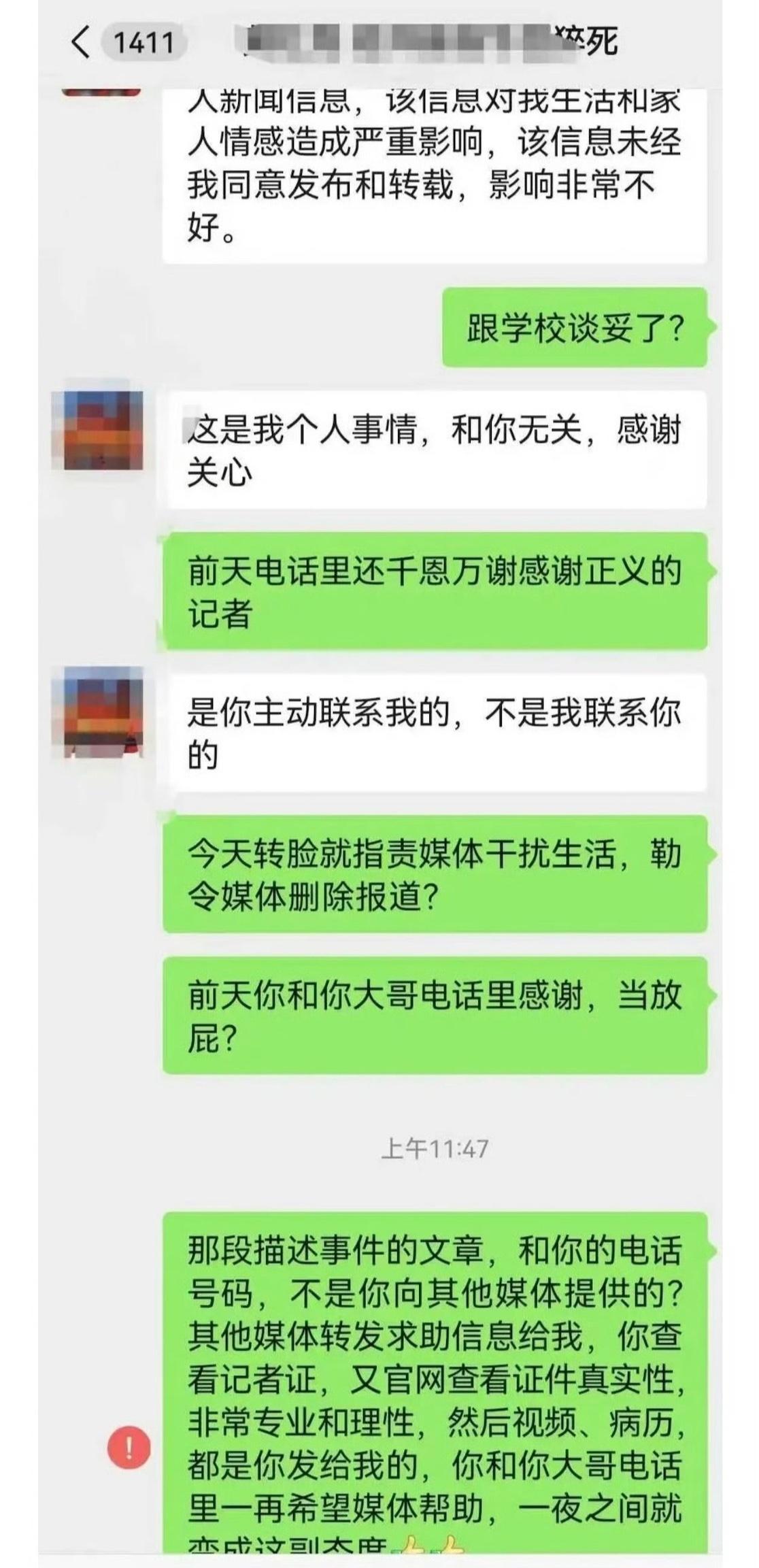 这就是合肥职校女教师家属的嘴脸,女儿死了要维权积极联系媒体,舆论起来和学校谈妥了,马上和帮助自己的媒体翻脸不认人。这些人真不值得帮助,他们其实算计的都是自己的私利,所谓网络舆论不过是施压的工具,媒体就是他们的尿壶,用的时候恨不得跪舔,用完弃之如敝屣。曾经一个兰州大学生发视频说在西安求职被骗,写了一篇帮她发声的文章,事情解决了,反手就来举报说侵犯她的肖像权,可她明明带着口罩。