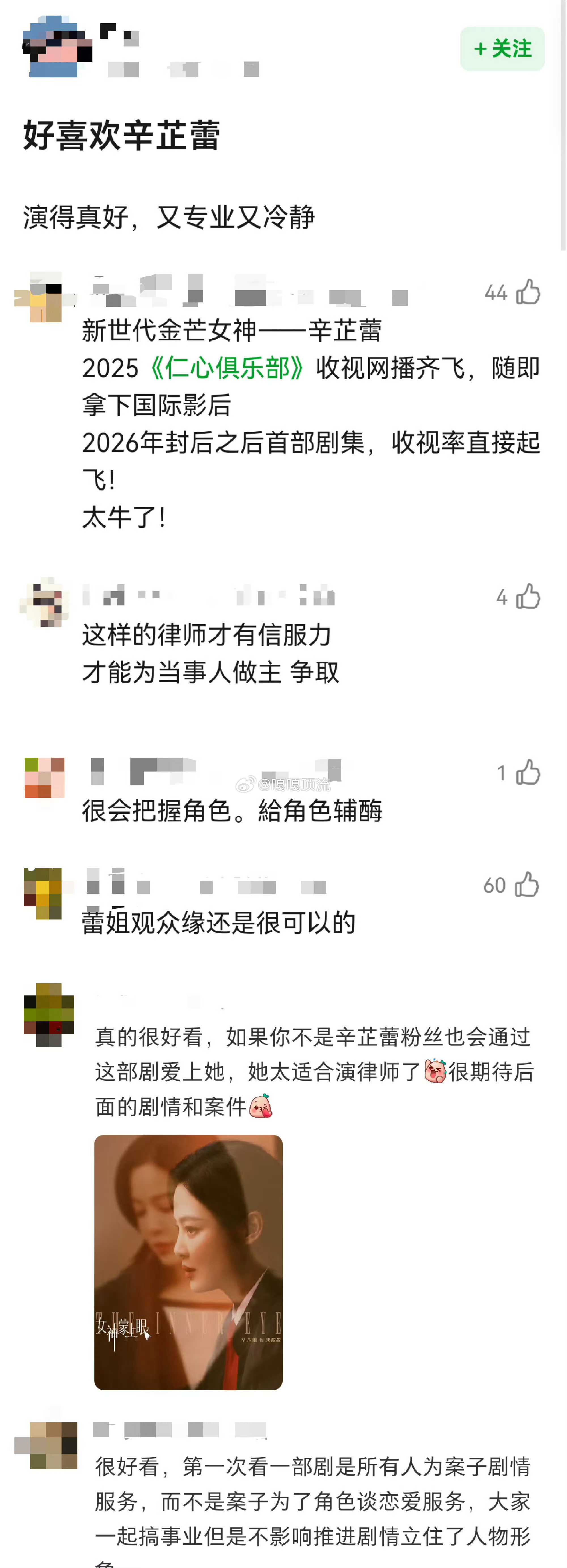 辛芷蕾 观众缘 终于懂辛芷蕾的观众缘为啥这么顶!新剧《女神蒙上眼》登陆湖南卫视,开播就登顶卫视收视第一,热度与口碑双丰收✨ 她饰演的唐盈盈堪称律政剧天花板,气场拉满不做作,法庭对峙戏高能炸裂,台词眼神全是戏,越看越上头!25年初《仁心俱乐部》早已斩获芒果年季佳绩,医者的温柔坚守、律师的飒爽果敢,她切换自如、精准拿捏~ 用作品说话、靠演技征服观众,部部实绩亮眼、角色出圈,这样有实力有魅力的女星,观众缘好到爆棚都是必然!