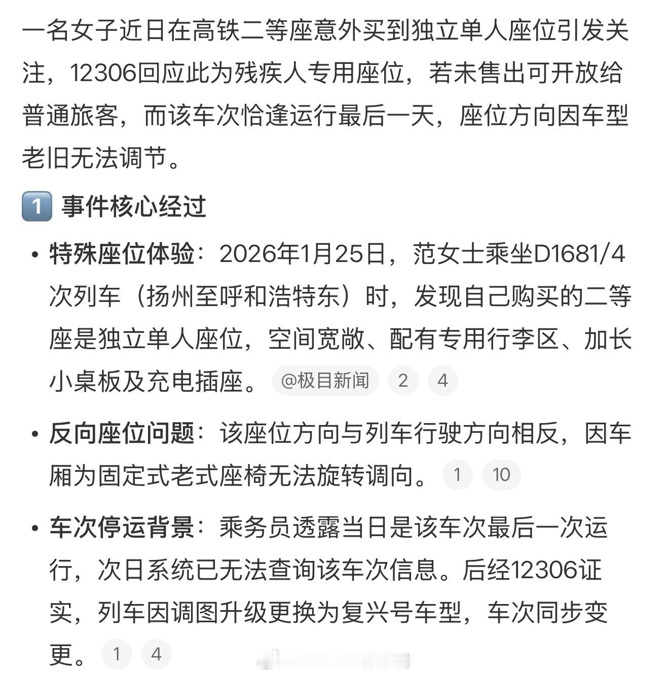 女子乘二等座买到单人独座残疾人专用座位 有温度
