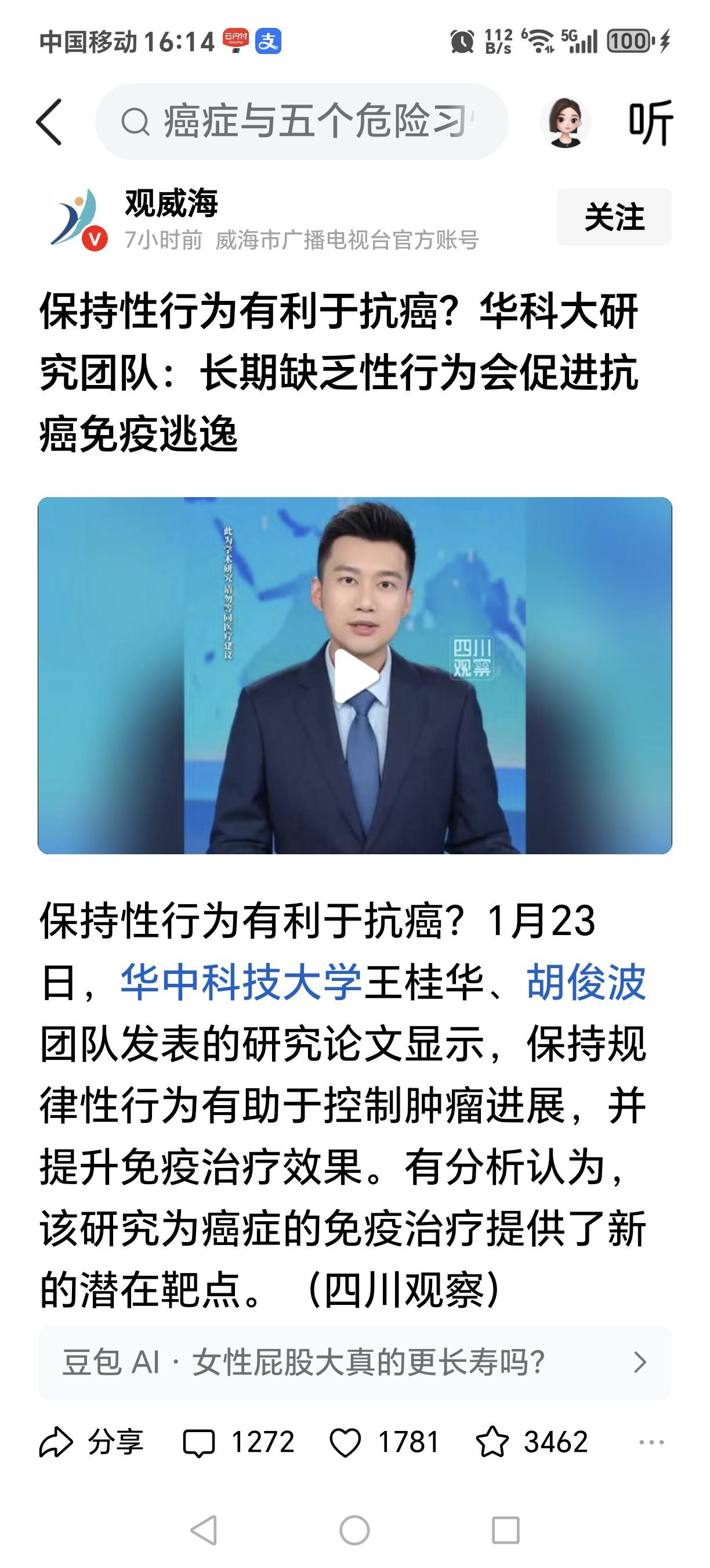 哈哈,性生活能抗癌?华中科大,我想问问,这算不算围魏救赵!如今生育率下降,离婚率增高,躺平不结婚的在蔓延!但是!没老婆的怎么办?已婚又单身的怎么办,难不成要…?