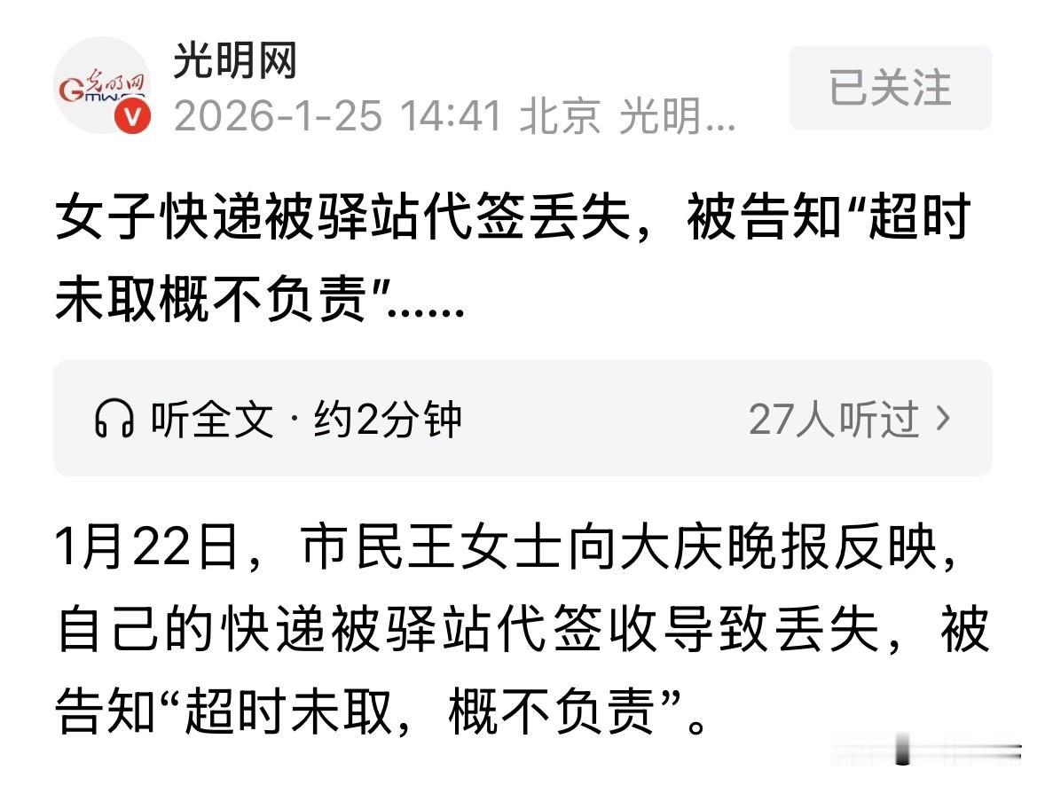 黑龙江大庆,去年10月,女子在外出差时,一朋友给她寄了一个包裹,今年1月女子出差回来,这才想起有个包裹没取,但工作人员说,时间太久了,快递早已不在驿站,至于在哪他们也不知道,而且,快递3天内没取就会被代签收,签收后他们只负责保管1个月,超时还没取导致丢失的,驿站不负责。女子认为这不合理。 王女士最近窝了一肚子火,因为一件几个月前的快递,搞得她是吃不好睡不香。 去年10月份,福建的一个朋友给她寄了点东西,偏偏赶上王女士出差在外,这包裹就一直存放在快递点,没有及时取。 等到今年1月份,王女士办完事回到大庆,冷不丁想起这档子事,她就赶紧翻出取件短信,跑到了那家快递驿站。 到了地方,王女士报了取件码,可工作人员在电脑上噼里啪啦敲了一阵,眼皮都没抬一下,就说查不到了,早就不在这儿了。 王女士赶紧问去哪了?工作人员说是因为时间太久,系统早就自动代签收了。 而且还有个规矩:超过一个月不取,丢了概不负责。 王女士听后特别生气,驿站咋能不经本人同意擅自处理包裹呢?你要处理,是不是也得提前知会我一声? 然而,整个过程压根没人给她打过一个电话商量,怎么就莫名其妙被代表签收了? 她当时收到了取件码,几天后又收到一条已代签收的通知,这就算完事了? 后来,记者跑去现场看了一眼,驿站墙上确实贴着一张取件通知。 上面写着,快递三日未取系统将自动签收,无法拒收!超过一个月未取,快递遗失本店概不负责。 面对王女士的质问,驿站的人还是那句话:时间太久了,真找不着,你自认倒霉吧。 王女士咽不下这口气,直接把电话打到了快递公司总部客服。 客服的说法跟驿站完全不一样,人家说得很清楚:未经收件人同意,快递点绝对不能私自签收!这是违规操作。客服登记了王女士的信息,承诺帮忙查找。 这事儿到底谁有理?咱们说了不算,得听专业的。 一位律师表示,只要快递员或者驿站没把东西亲手交到王女士手里,而是擅自点了“已签收”,那这个交付就没完成,风险也就没转移。 换句话说,哪怕系统显示签收了,只要王女士没拿到东西,这责任就还在快递公司和驿站身上,他们得全赔。 至于墙上贴的那个“概不负责”的告示,那就是一张废纸。 这种单方面免除自己责任的声明,在法律上叫无效格式条款,也就是俗称的霸王条款。 根据《民法典》第497条,有下列情形之一的,该格式条款无效:具有本法第一编第六章第三节和本法第五百零六条规定的无效情形;提供格式条款一方不合理地免除或者减轻其责任、加重对方责任、限制对方主要权利;提供格式条款一方排除对方主要权利。 驿站墙上张贴的取件通知属于典型的格式条款。 通知上规定“三日未取系统自动签收”及“超过一个月遗失概不负责”,属于不合理地免除或者减轻己方责任。 根据《快递暂行条例》,快递必须由收件人当面验收,驿站作为服务方,有妥善保管和准确交付的法定义务,不能通过单方面告示将责任甩锅给消费者。 另外,这个条款排除了收件人的主要权利。 王女士作为消费者,享有要求驿站安全保管并亲自签收快递的权利。 驿站在未电话沟通、未获授权的情况下擅自代签收,并以超时为由拒绝赔偿,实质上是利用格式条款剥夺了王女士的验收权和索赔权。 所以,驿站张贴的霸王条款在法律上属于无效声明。即便快递真的丢失,驿站和快递公司也不能以此免责,必须对王女士的损失承担全部赔偿责任。 这真要闹上法庭,法院根本不认,该赔多少还得赔多少。 现在的快递驿站为了省事,搞什么自动签收,把风险全甩给消费者。 平时如果不在家,最好还是跟快递员沟通好,或者让朋友代取,别真指望驿站能给你一直免费保管。 驿站也是,别以为贴个条子就能免责了,从法律角度这是不被允许的。 对于这件事,你怎么看? 欢迎关注@一案一论