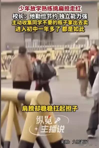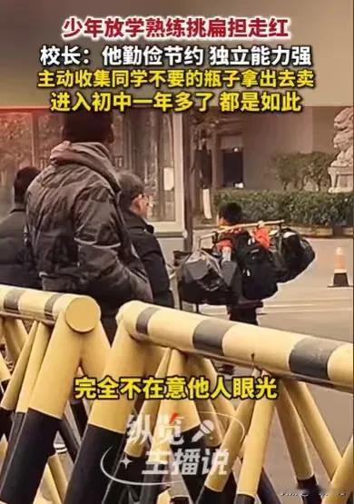 “这是歌颂苦难吗?”广西贵港,校园里,放学了,一个少年,肩上一根蚊帐竹竿,两头挑着打包好的行李,前方推着行李,他步伐稳健,神情自若,自信地走出校园,这一幕令人动容,校长说:这个少年阳光向上,独立能力强,勤俭节约,入学一年多主动收集同学们不要的矿泉水瓶,周末拿出去卖。网友却说:这代表什么,是苦难吗? 1月23日下午放学时分,一个个子不高的少年,肩上稳稳地扛着蚊帐竹竿,挑着两个大包裹,步伐稳健地走出校园,他神情自若,眼里透着一股自信。 这个少年完全不在乎别人的眼光,走的每一个步伐,都透着一股坦然和固定笃定,这一幕让人动容了。 拍下这一幕的是郑先生,他当时远远地就看到这个少年与众不同,这个少年没有像别的同学一样,东张西望等待家长来接,他只是默默地挑着身上的蚊帐竹竿,两头的大包裹,看起来有些沉甸甸的。 身上有担,这朴素的一幕,其实在70后,80后,这些人小时候上学,这一幕是经常可以看到的。 但现在,这一幕已经很少出现在我们的生活中了,现在的孩子,放学了有家长接,有的孩子,还有豪车接,这些孩子就像是温室里的花朵,成长都看着空调的度数。 这就尤其显得,这个肩上有担的少年,他就如野生玫瑰,直面烈日风霜。 当郑先生看到这名少年,如此神态自如,完全不在意别人的眼光,只顾着走自己的路,这一幕实在让他感慨万分。 这难得的一幕,更是让他拍了下来,他发了出来,少年的身影,让大家感慨万分。 学校的校长看到了,马上就说清楚了这个少年的情况,他说这个少年阳光向上,本身的独立能力就非常强,他读初中一年多,平时就把同学们喝过的矿泉水瓶,收集在一起,周末了就挑出来卖。 校长话一出,再配上郑先生拍下的那令人动容的一幕,网友们热议纷纷了。 有人说,这有钱的孩子谁会这样做,显然这孩子就是家中条件不好,所以才会早早懂事,这是典型的穷人家的孩子早当家,这样的孩子不值得可怜,要怪就怪他的父母不争气。 也有人不同意这个说法,他们看着少年,如此不在乎别人的眼光,这就如倔强地打工人,他们内心有这样的执念,面子能值多少钱,自信才能过好自己的人生。 他们纷纷支持这个少年,觉得少年能够放得下面子,什么都愿意去做,长大之后走出社会,就不会挑三拣四了,他如此有担当,长大之后也不会差到哪里去,他能成就大事。 还有的人表示,少年的行为让他们很感动,少年的懂事也让他们心疼,但他们不向往,也不希望自己的孩子像少年这般,不少人还是希望自己的孩子,能够得到他人的尊重,活得体面。 不管怎么说,这个少年,他步伐坚定,眼里透着自信,这足以说明,即使他生活苦难,他也不会在乎别人的眼光,这样的孩子,长大之后,确实会更有出息。 关键的一点就是,他不能被别人的目光左右,即使他的这一幕,令人动容,也会有人歌颂苦难,衬托他的不平凡,少年都应当有自己的坚定信念,走自己的路,坚定地走下去,闯出属于自己的人生。 一根蚊帐竹竿,两袋包裹,希望这个少年扛起来的不是行李,不是苦难,而是他那不惧一切,能够勇往直前的自信,希望他拥有无限的可能,希望他扛起来的是自己美好的人生。 当然如果少年确实是因为家庭困难,需要收集同学们的矿泉水瓶拿出去卖换钱,那么学校就应当提供帮助了。 《义务教育法》,国家实行九年义务教育制度,所有适龄儿童、少年都须接受教育,且实施义务教育不收学费、杂费。 初中阶段依然属于9年义务教育,如果少年确实困难,学校应当免除相应的费用。 那么你认为这是歌颂苦难吗?