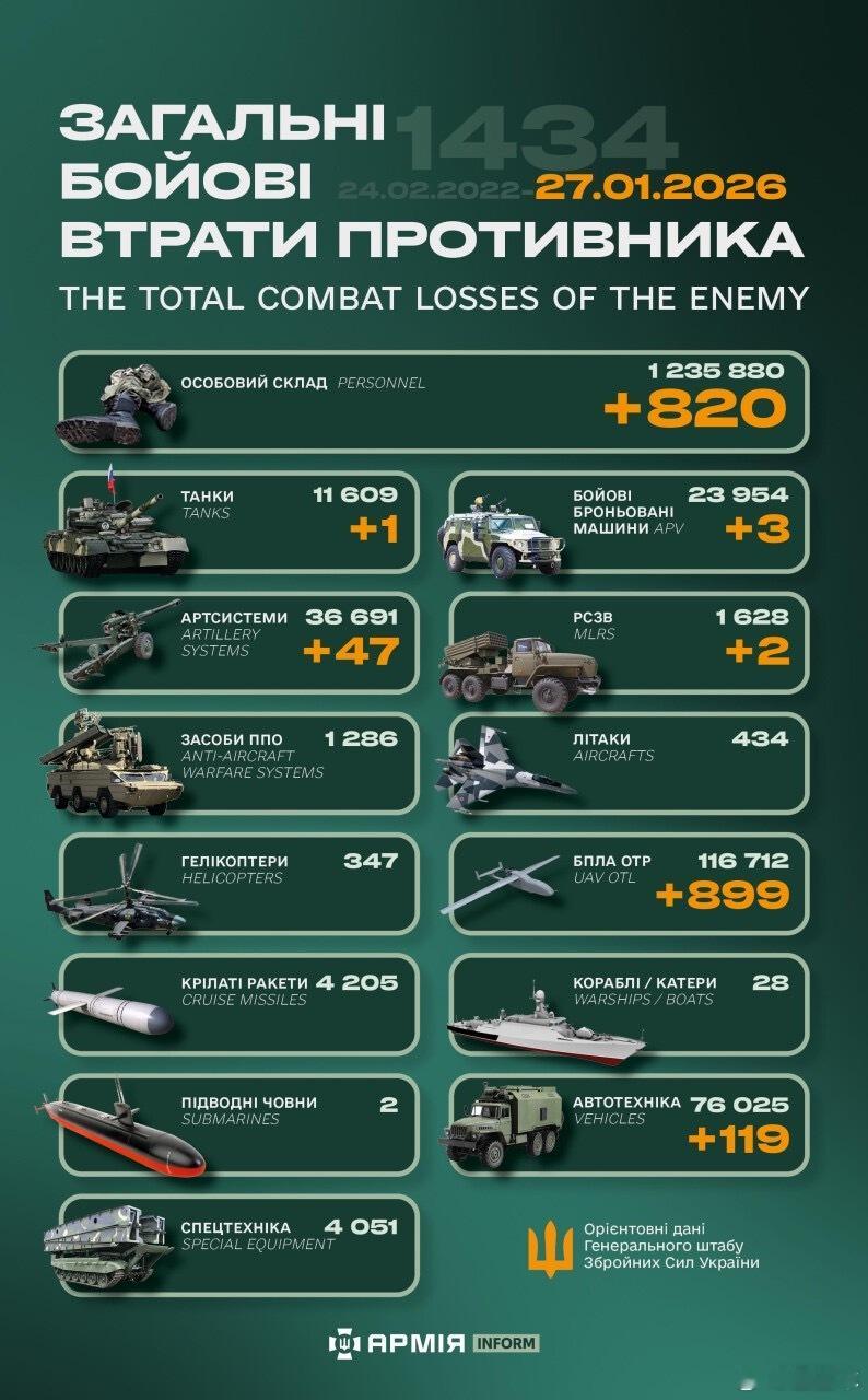 俄乌冲突 “世界第二军”俄罗斯只示范一次现代战争速度1小时22分又1434天乌克兰武装部队24小时又539天被驱逐出库尔斯克截至2026年1月27日“超级大国”俄罗斯损失战报约1235880头11609辆坦克23954辆装甲车36691门火炮1628门多管火箭炮1286套防空系统434架飞机 347架直升机116712架无人机4205枚导弹28艘军舰2艘潜艇76025辆汽车4051套特殊装备