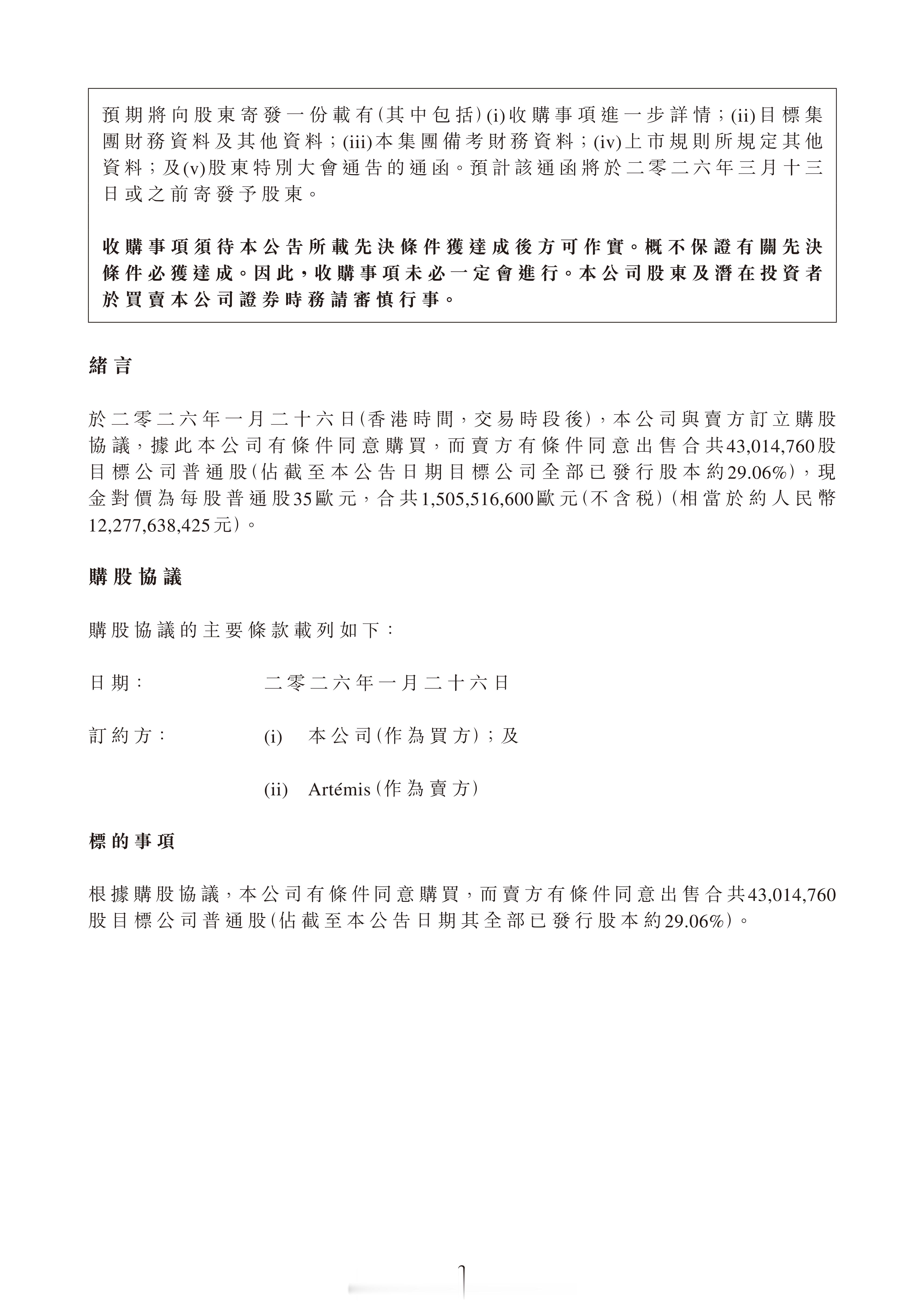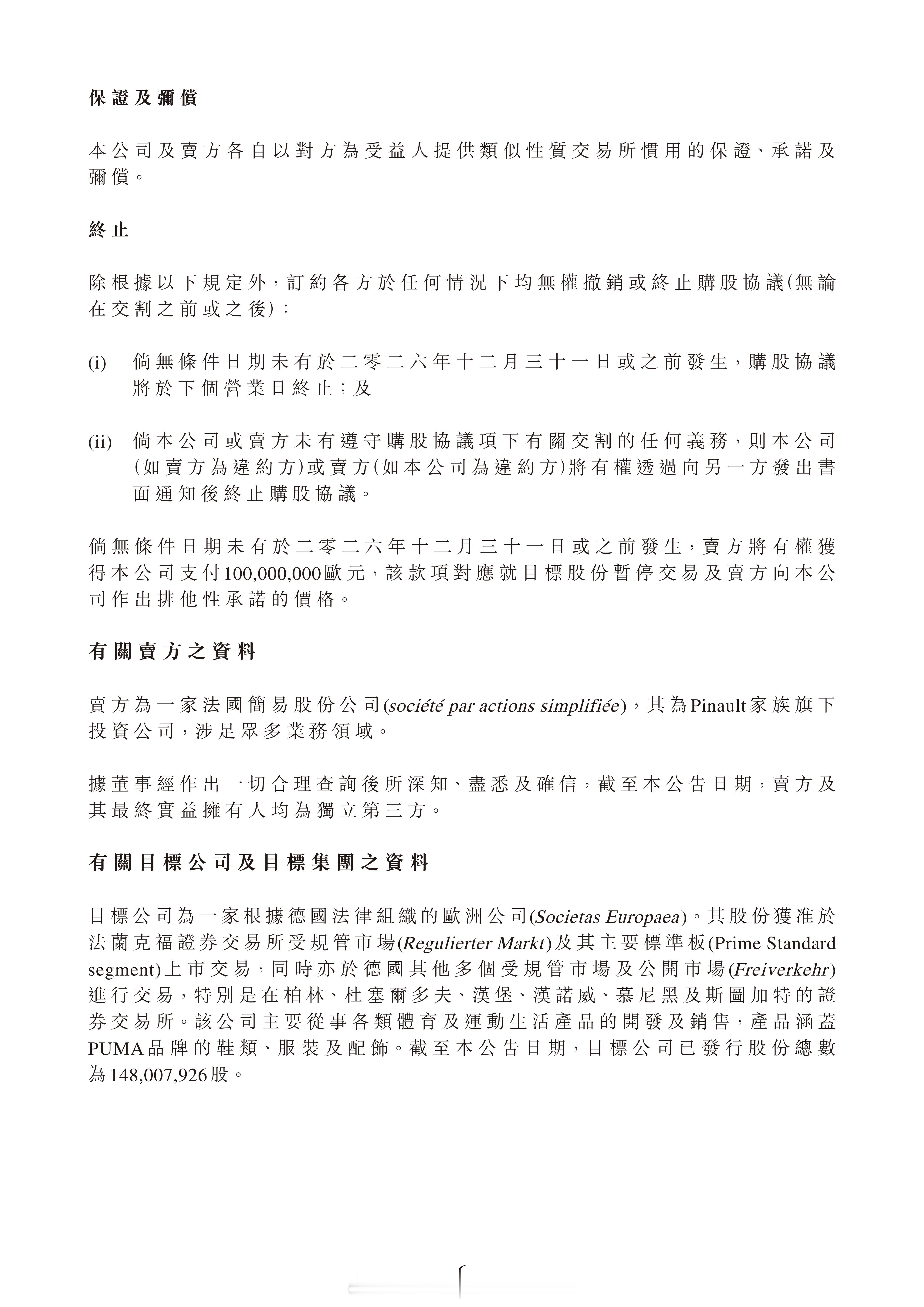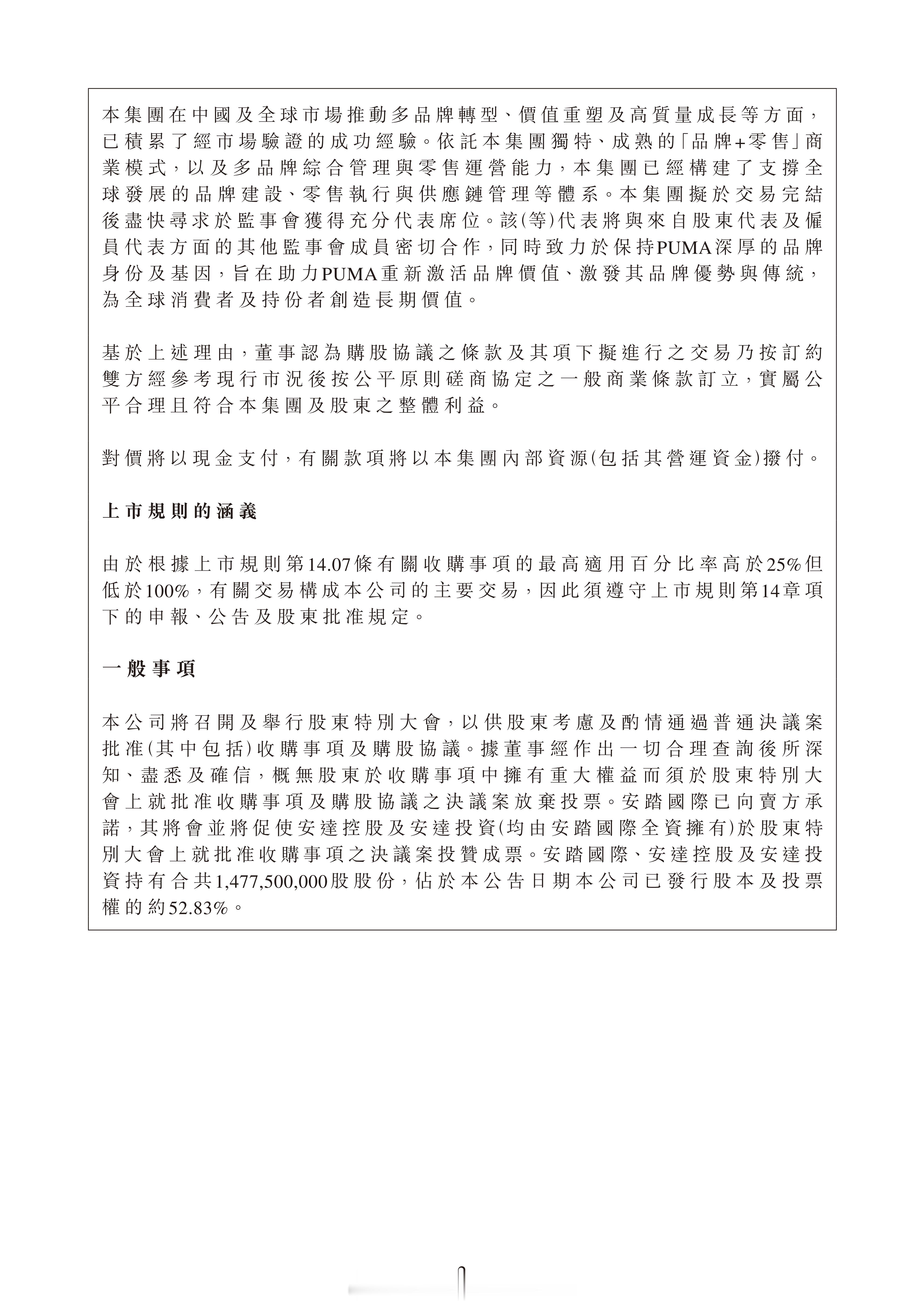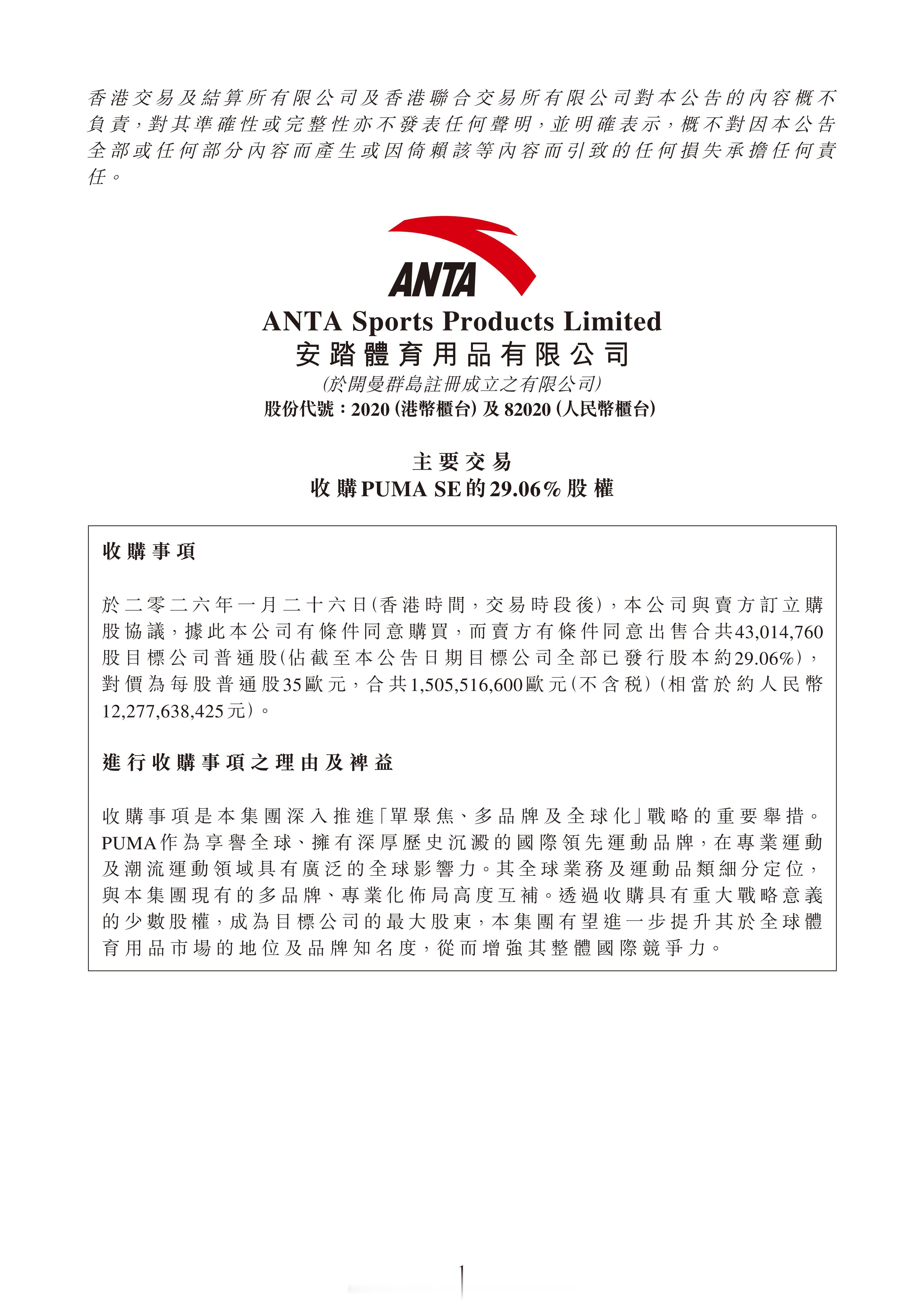 安踏体育帝国的势力范围还在进一步扩大中……之前传闻颇久的安踏收购 PUMA 一事今日终于尘埃落定:今天(1月27日),安踏港股上市公司在港交所发布公告,向 Artémis 收购 PUMA SE 4301.48 万股,占 PUMA SE 的 29.06% 股权,对价为每股普通股 35 欧元,合共 15.06 亿欧元(约 122.78 亿元人民币)。若此次收购成功,在此次收购完成之后,安踏成为 PUMA 的最大单一股东。安踏体育收购彪马公司29.06%股权安踏体育对外投资超30家企业