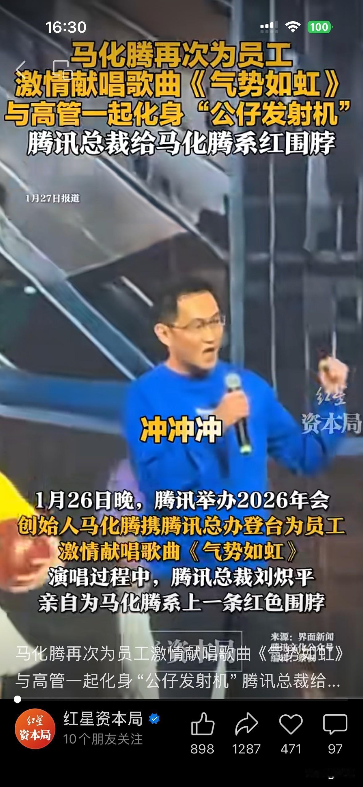 马化腾再次为员工激情献唱歌曲《气势如虹》,向世界的小企鹅们喊出了“冲冲冲”!