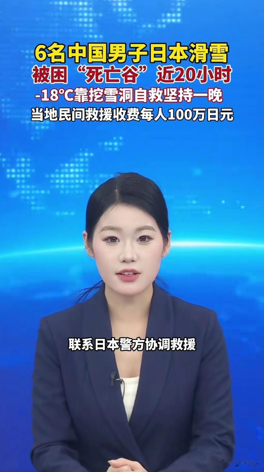 1月25号消息6名中国男子在日本滑雪 被困“死亡谷”近20个小时 挖雪洞自救,坚持到次日凌晨 中国驻新泻总领馆得知情况后,及时处置,联系日本警方协调救援 最终6个人被成功营救,当地民间救援收费,每人收费100万日元,约合人民币4.5万,就是不清楚是否支付 这6个活大哥真是“好样”的,咱们国内那么多的雪山,难道装不下你们6个吗,非得跑到日本去滑雪,给人家送钱不说,还让别人看笑话 另外这两天日本下的都是暴雪,还有不少中国游客被困在北海道机场,超市货架上的吃的都卖完了。