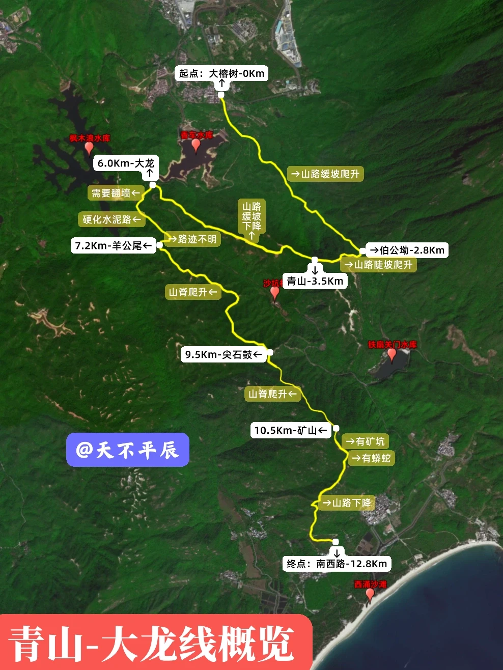 青山-大龙线,位于深圳市大鹏半岛南部,是一条非常小众的山脊穿越路线。路线由两段组成,一段是从大榕树-伯公坳-青山-大龙穿越路线,一段是大龙-矿山-西涌南西路山脊穿越路线(大龙线/矿山郊野径),全程约13公里,爬升约900米,主要要翻越两座小山(青山和矿山),大概需要5~7小时,路线相对简单。