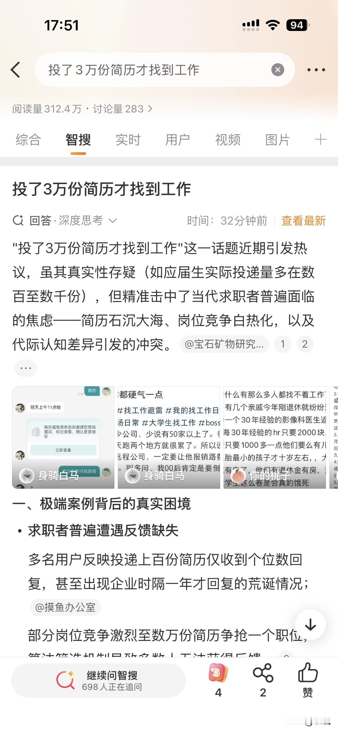 找工作投几万份简历虽是个例,但几百份是常态。 现在求职就像撞大运,简历投出去大多石沉大海,已读不回是家常便饭,甚至还有企业拖一年才回复的。 学历和能力不再是唯一的通行证,经验和运气反而更重要。 年轻人在“理想工作”和“现实骨感”之间反复横跳,耗尽了精力和信心。 这不仅是个人的困境,更是整个社会就业环境的缩影,说明优质岗位太少,求职竞争太残酷。
