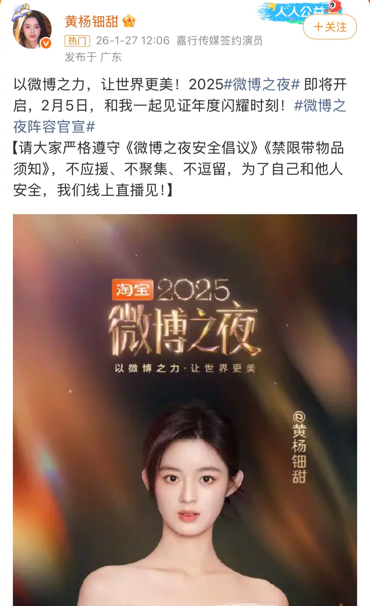 黄杨钿甜官宣微博之夜官宣啦!05花黄杨钿甜确认出席微博之夜,新生代小花气场直接